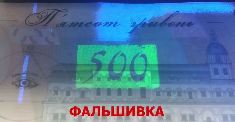 1.Ярко выражены синие области с обратной стороны банкноты в верхней и нижней части. На всех подлинных банкнотах номинала 500 гривен синие метки сверху и снизу реализован без четких границ — переход об более насыщенного цвета до менее насыщенного плавный. На фальшивках этот защитных признак подделан с четкими границами, что очень заметно при сравнении оригинала и подделки.