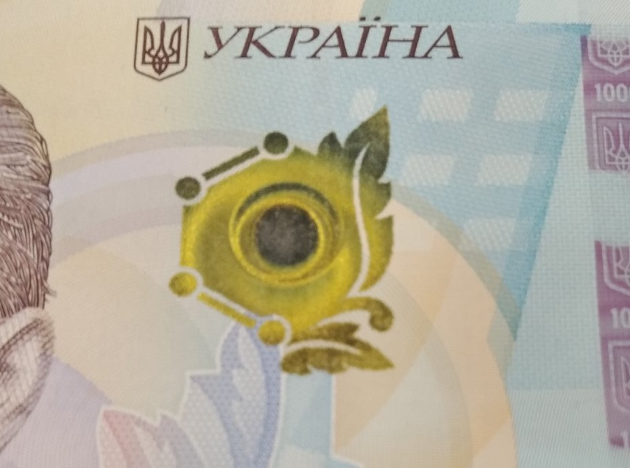 Из защитных элементов, которые можно выявить без детектора валют стоит отметить ряд наиболее очевидных. Среди них голографическая лента поперек банкнот с прохаождением между слоями бумаги купюры. На ней изображена цифра 1000 и герб Украины. При просмотре на ленту под разным углом изображение переливается и создается эффект подвижной картинки. По краям банкноты изображены рельефные элементы насечки справа и слева, а также справа вверху и внизу элементы с повторяющимися изображениями герба. Тоже рельефные. Надпись 1000 слева внизу тоже имеет ярко выраженный рельеф. Как и на банкнотах номиналами 100 и 500 грн нового образца присутствует голографический элемент с SIP-эффектом. При смене угла обзора также создается ощущение объемного изображения. На куюре 1000 грн это изображение вероятней всего символзирующее единство природы и науки. Что характерно, центральная часть этого изображения, выполненная в виде черного круга матовая.