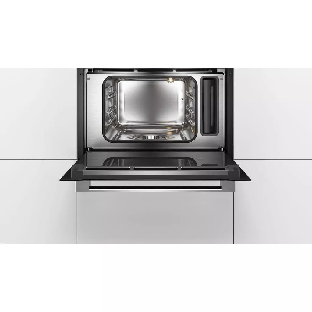 Духовой шкаф Bosch CDG634AS0 создан для того, чтобы вы могли воплотить в жизнь свои самые смелые кулинарные задумки. Внешнее оформление техники очень лаконичное и сдержанное, поэтому в ее облик отлично вписывается минималистичный блок управления, имеющий такие составляющие как TFT-дисплей и сенсорные кнопки. Они помогут настроить технику на четкую работу в диапазоне 30-100°C.