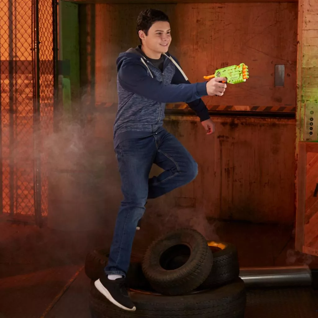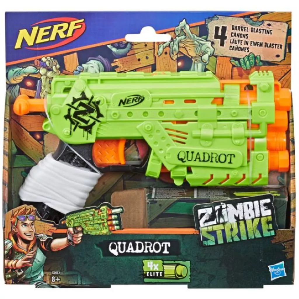Стреляйте 4-мя стрелами подряд из бластера Нёрф Зомби Страйк Квадрот. Вставьте стрелы в каждый из четырех зарядников, потяните за поршень для взвода, нажмите на курок и стреляйте. Для последующего выстрела опять потяните за поршень, нажмите на курок. Компактный размер бластера дает возможность зомби-бойцам оставаться мобильными, защищая свою территорию. Бластер зеленого цвета оснащен и укомплектован крепежной рейкой и 4-мя стрелами Нёрф Зомби Страйк.