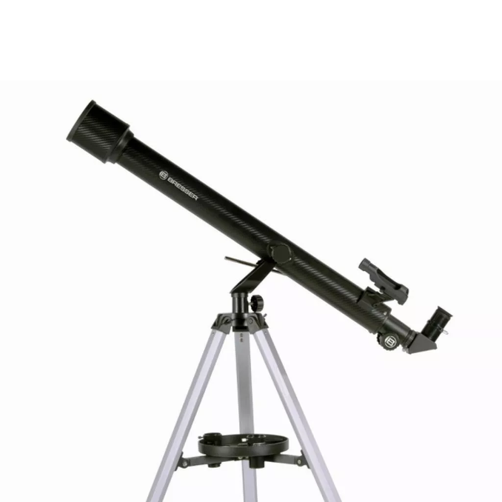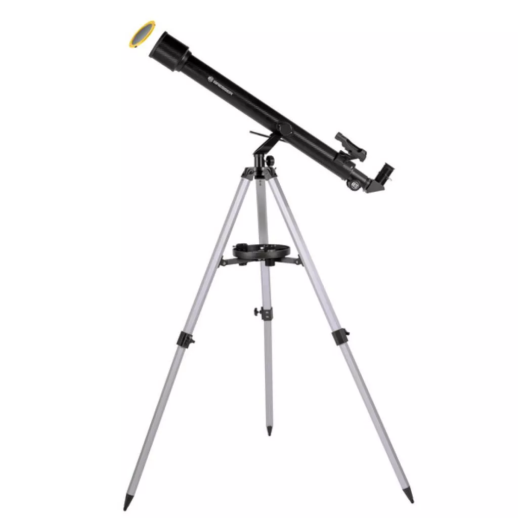 Данная модель телескопа обладает увеличенным фокусным расстоянием, что дает возможность получить приличное увеличение даже с 20-мм окуляром. Телескоп является переходной моделью от детских к более серьёзным астрономическим приборам. Это хороший выбор для подростков, делающих свои первые шаги в астрономии. Телескоп с ручным управлением Bresser Stellar Solar 60/800 AZ (carbon) обладает качественной просветлённой антибликовой оптикой, позволяющей наблюдать звёзды слабого свечения (до 11,5 звездных величин), Юпитер, кольца Сатурна, Марс, Венеру, Уран и Нептун в виде звезд, кометы, пролетающие в нашей Солнечной системе. Но всё же главным объектом для наблюдений станет Луна – спутник Земли, который всегда безошибочно можно найти на небосклоне и который хранит ещё множество тайн. При использовании апертурного фильтра возможно определять структуру солнечных пятен.