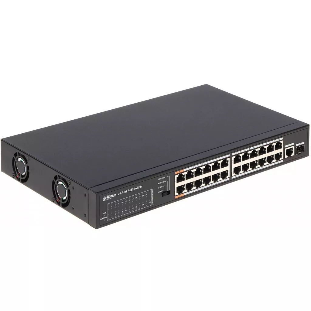 DH-PFS3125-24ET-190 - управляемый 24 портовый PoE коммутатор, который поддерживает передачу данных и питания PoE. оснащен и укомплектован двадцатью четырьмя Fast Ethernet с поддержкой PoE (802.3af/at/bt) Комбо портами 1х SFP или 1х Gigabit Ethernet. Высокий класс защиты, Прочный металлический корпус.