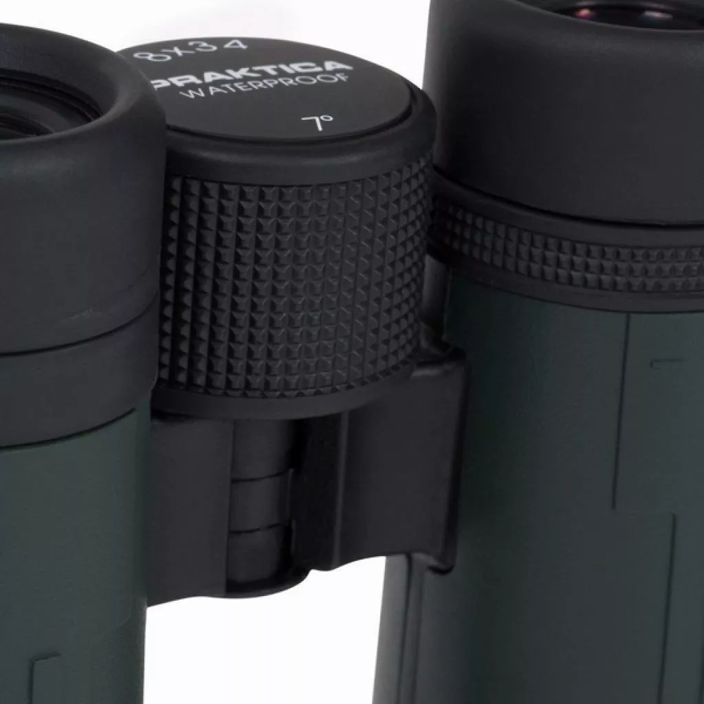 Удобство дизайна бинокля Praktica Pioneer 8x34 WP достигается современной конструкцией корпуса с двумя шарнирами (Open Hinge). Благодаря такой компоновке бинокль приобрел большую надежность и удобство использование (эксплуатации). Бинокль практически нереально выпустить из рук, что очень важно при быстром передвижении для охотника или туриста.