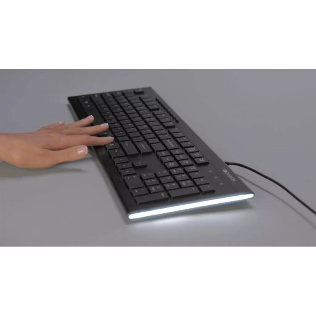 Эта ультратонкая проводная клавиатура с удобными клавишами и декоративной LED-подсветкой по бокам обновит внешний вид устройства вашего рабочего стола. Её клавиши прочные и приятные на ощупь, практически не слышны при нажатии. Благодаря текстуре поверхности, клавиатура защищена от пятен и отпечатков пальцев. Над стандартным набором клавиш размещены мультимедийные кнопки, позволяющие быстро управлять браузером, медиаплеером, звуком и калькулятором.