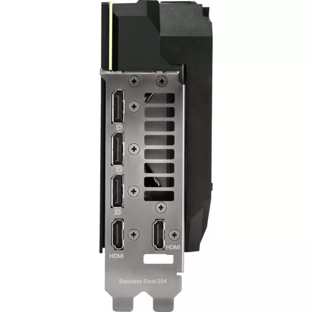 Передняя часть видеокарты будет наиболее заметной в большинстве компьютерных сборок, поэтому ее дизайну было уделено особое внимание. Работу встроенного элемента адресуемой подсветки можно настроить и синхронизировать с подсветкой других компонентов Asus с помощью приложения Armoury Crate. Электропитание устройства обеспечивается посредством пары 8-контактных разъемов, снабженных встроенной системой мониторинга. Если видеокарта не будет получать достаточно электричества от блока питания, загорится красный предупреждающий индикатор. Спереди также можно увидеть усиленную металлическую раму, придающую прочность всему устройству.