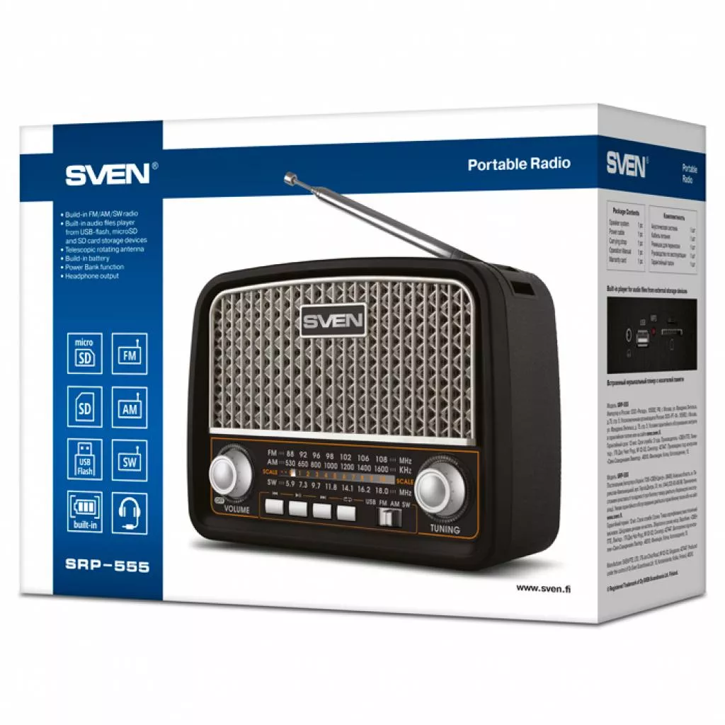 Линейка радиоприемников SVEN пополнилась моделью SRP-555. Устройство имеет встроенное FM/AM/SW радио, поворотную телескопическую антенну, возможность воспроизведения музыки с USB flash и microSD карт памяти и встроенную батарею.