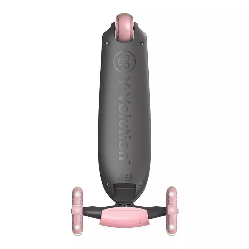 Колеса изготовлены из PP материала, они светятся во время езды благодаря LED-подсветке. Размер передних — 120 мм, задних — 70 мм. К тому же заднее колесо выполнено широким для большей устойчивости. Благодаря такому перечень функций и возможностейу YVolution Kiwi, наверное, лучший первый самокат ребенка.