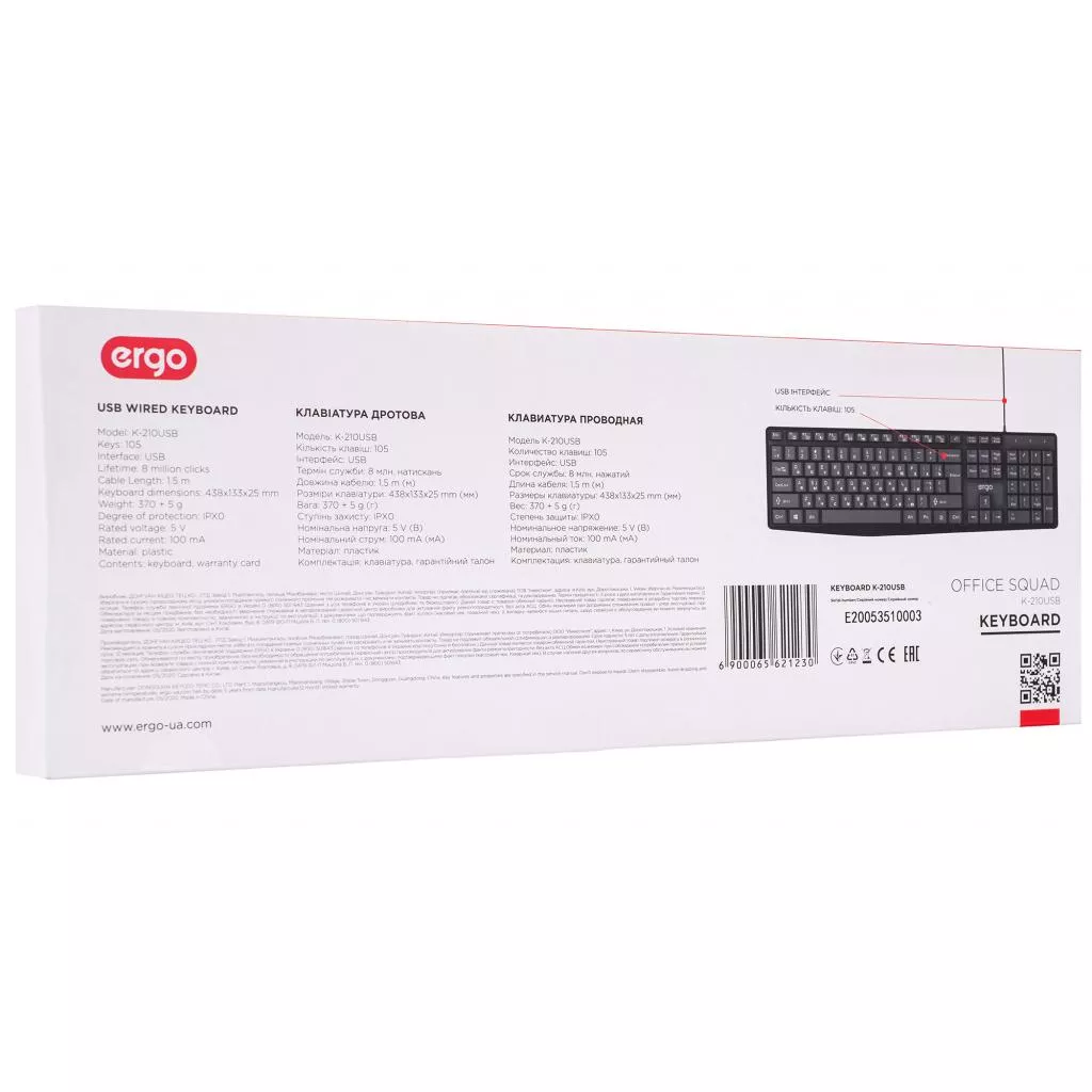 ERGO K-210 – надежный и стабильный инструмент для Ппрактически любой компьютерной работы. Мембранная клавиатура изготовлена из крепкого пластика, оснащен и укомплектована 105 клавишами и имеет высокий Уровень (степень) защиты от влаги. Кнопки способны выдержать до 8 миллионов нажатий, давая быстрый и четкий тактильный отклик.