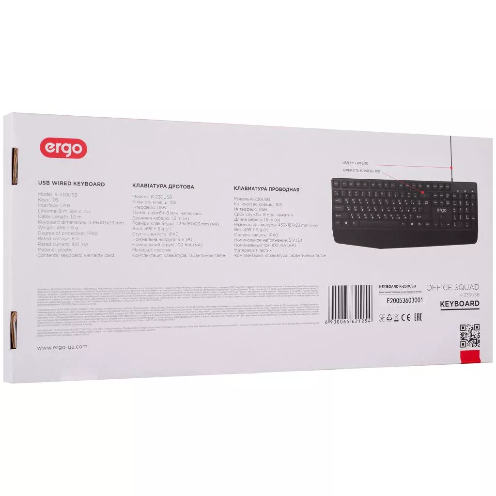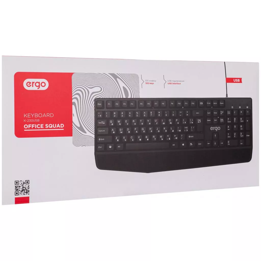 ERGO K-230USB – надежный и стабильный инструмент для работы за компьютером: учебы, программирования или набора текстов. Мембранная клавиатура изготовлена из крепкого пластика, оснащен и укомплектована 105 клавишами и имеет высокий Уровень (степень) защиты от влаги. Кнопки способны выдержать до 8 миллионов нажатий, гарантируя быстрый и четкий тактильный отклик.