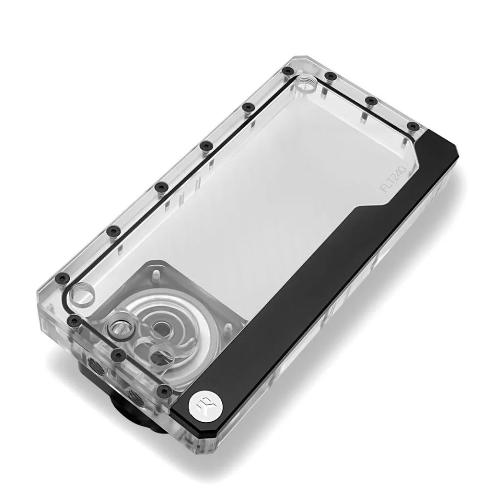 Плоский насос-резервуар EKWB EK-Quantum Kinetic FLT 240 D5 PWM D-RGB — Plexi является новым революционным решением линейки продуктов EK-Quantum Volume FLT D5, оснащен и укомплектованных адресной многоцветной подсветкой. Эти плоские резервуары серии (модельного ряда) FLT D5 обеспечат большую гибкость при установке, поскольку они не требуют сверления новых монтажных отверстий в вашем корпусе. Главное отличие от обычных EK-Quantum Volume FLT заключается в наличии оригинального интегрированного насоса D5, способного обеспечивать расход хладагента до 1500 литров в час при максимально и в полном объемем напоре до 3.9 метров.