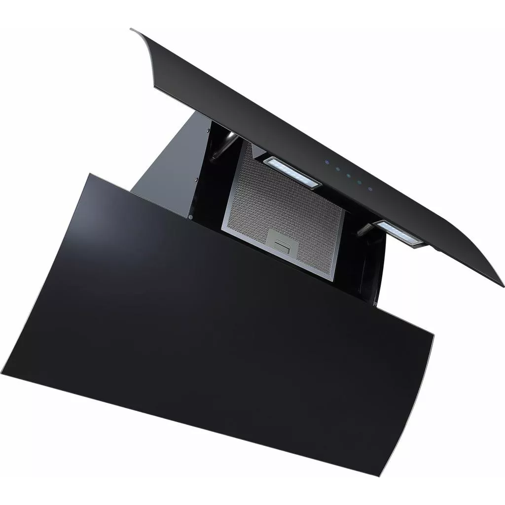 Автоматическая настенная вытяжка шириной 90 см, черного цвета. Устройство имеет чрезвычайно современный дизайн - размещена под углом гладкая стеклянная поверхность. Здесь также использованы передовые технологии, среди них - автоматическое открывание лобового стекла устройства, во время его работы. Благодаря этому, устройство имеет очень эстетичный вид, а также таким образом, здесь совсем незаметно фильтров, когда вытяжка не в рабочем состоянии. Сенсорное управление гарантирует полный комфорт использование (эксплуатации). В вытяжке имеется современное светодиодное освещение белого цвета. Высокая производительность дает возможность очень эффективно избавиться от пара и запахов на кухне. Благодаря трем уровням мощности полностью оптимизирована работа устройства. Белый дисплей идеально сочетает и совмещается с общим дизайном вытяжки. Это современное оборудование станет настоящим украшением вашей кухни и дополнит современную композицию вашего интерьера.
