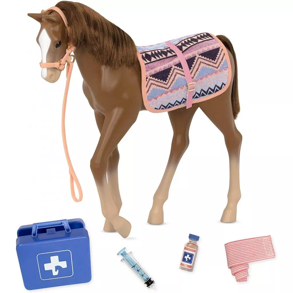 Маленький жеребенок Our Generation с милым и сладким именем Карамель прекрасной каштановой окраски, имеет бежевые копыта, мягкую шелковистую гриву и хвост, которые очень приятно расчесывать. Куклам будет удобно сидеть на кружевном одеяле, покрывающий лошадку.