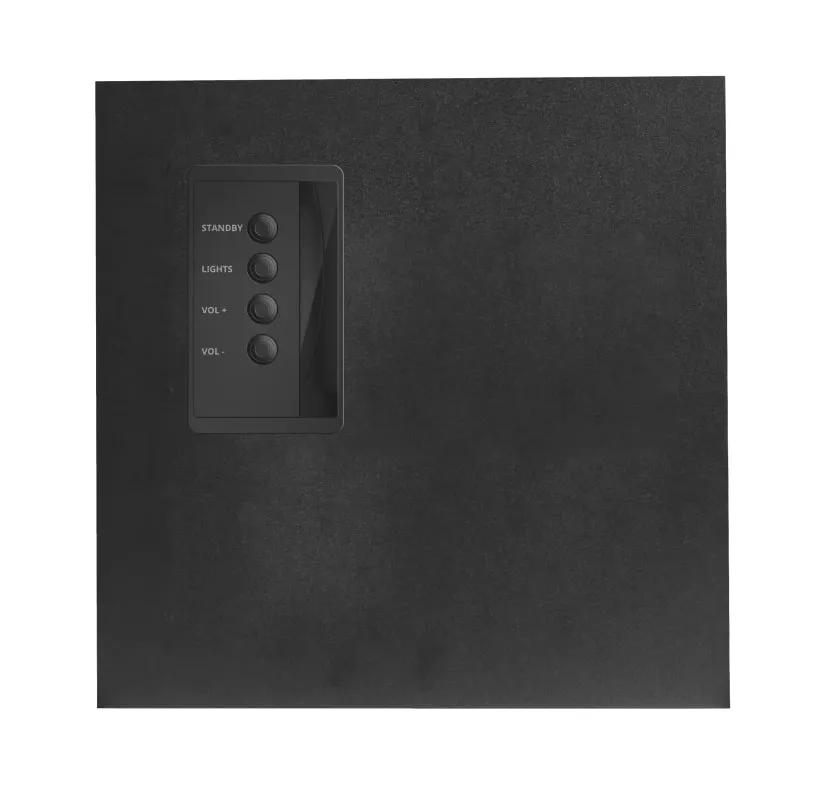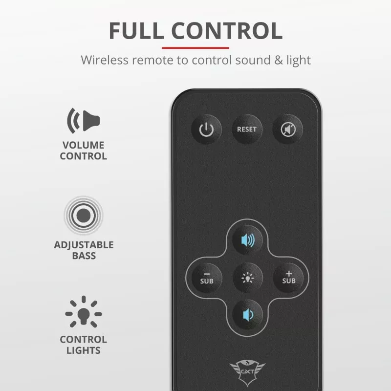 В комплект к этой мощной акустической системе добавляется удобный беспроводной пульт дистанционного управления. Вы можете легко регулировать громкость и выключать звук, оптимизировать басы и изменять режим подсветки, а также включать и выключать динамики одним нажатием кнопки.
