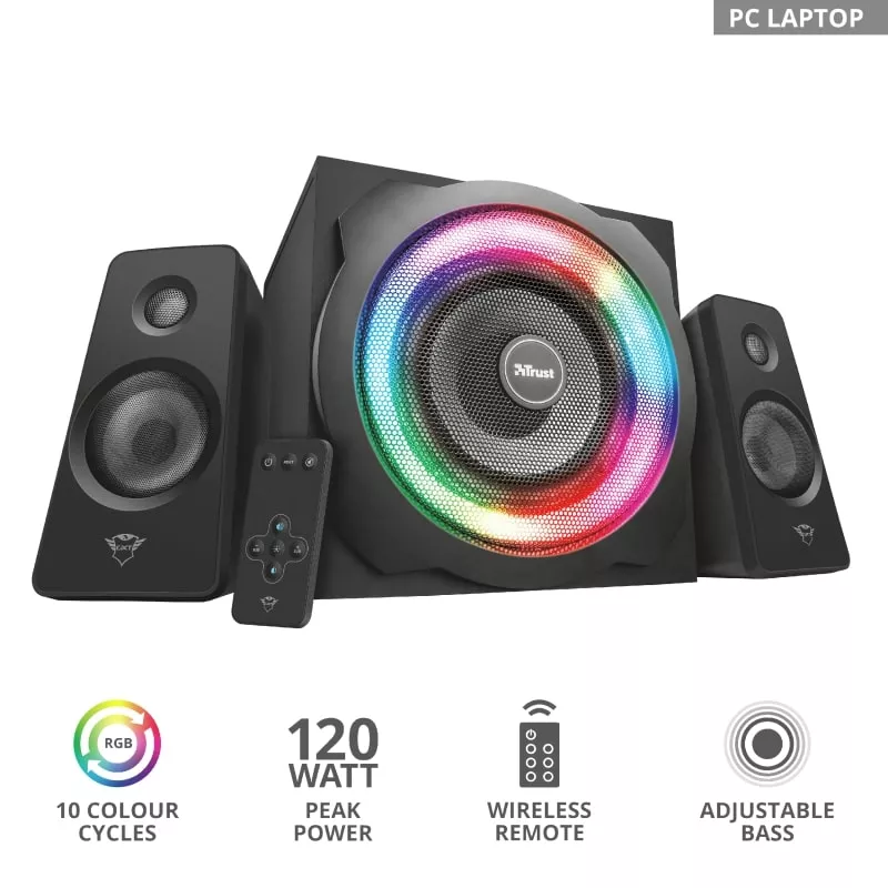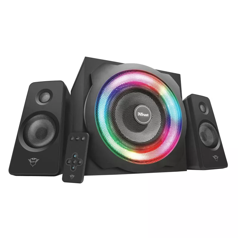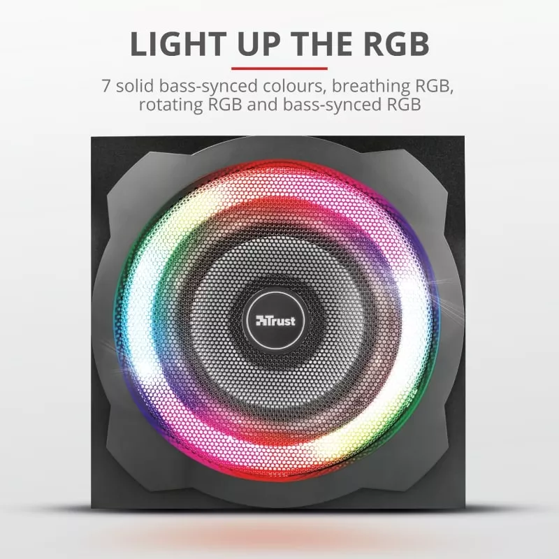 Потрясающая мощность низких частот, высокое качество звука и впечатляющий игровой дизайн — все в одном: комплект динамиков GXT 629 Tytan 2.1 с подсветкой RGB изменит ваше представление о звуке. Играя в новейшие игры, слушая музыку или просматривая фильмы, все это вы будете делать с лучшим звучанием. Эти динамики не только усиливают мощный звук, они взрываются цветом! Разноцветная светодиодная подсветка RGB на сабвуфере в сочетании с матово-черными сателлитными динамиками подойдут к любой конфигурации игровой станции. Вы можете выбрать один из 7 однотонных цветов, синхронизированных с басами (красный, зеленый, синий, желтый, фиолетовый, голубой и белый). Или же выберите циклическую чередование всех цветов, пульсирующую подсветку с чередованием цветов или подсветку RGB, синхронизированную с басами: у вас есть все возможности!