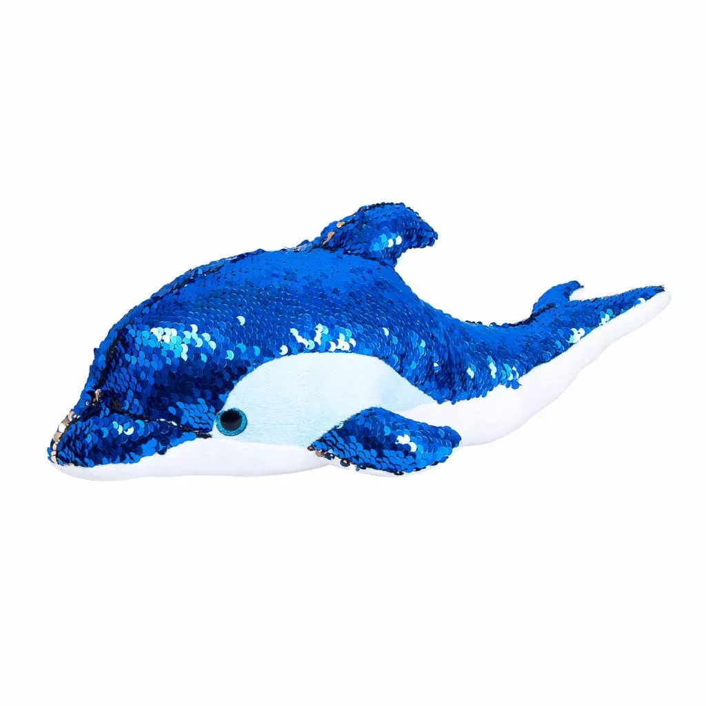 Спинка дельфина покрыта блестящими двусторонними пайетками. Если его погладить - цвет изменится на золотой.