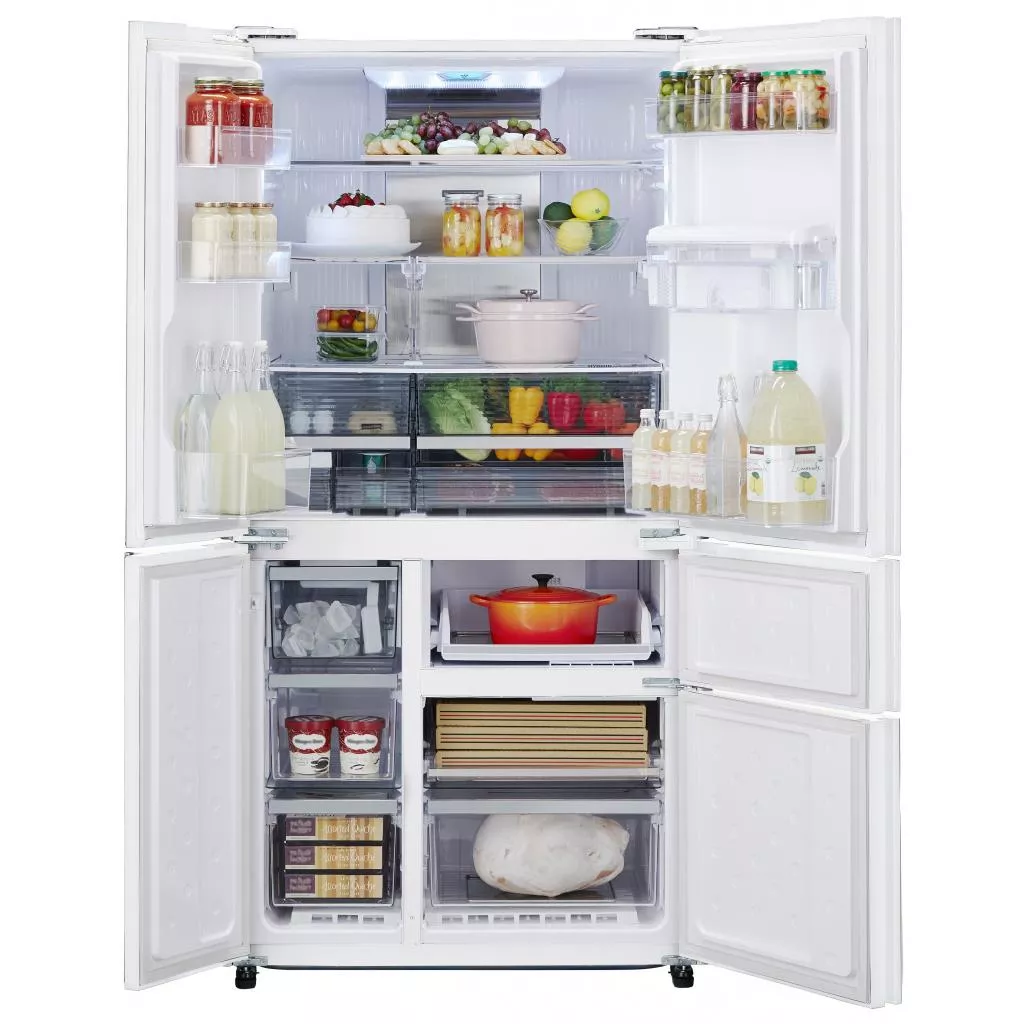 Sharp SJ-WX830AWH – многодверный холодильник от компании Sharp, который используется для хранения множества продуктов, так как общий полезный объем устройства составляет 758 литров. Холодильник имеет 5 дверей – 2 двери на холодильную камеру и 2 на морозильную, а также ящик морозильной камеры. Холодильник управляется электронным путем, имеет дисплей и современную эргономичную структуру внутри.