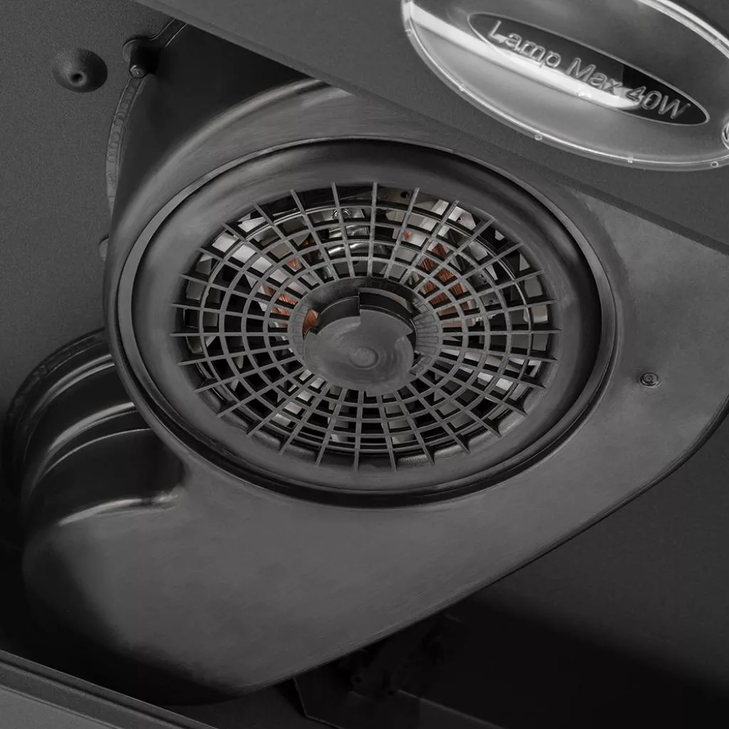 Pyramida UX 50 имеет мощный и производительный мотор на 172 Вт. Он надежно зашищен от проникновения жира и пыли жироулавливающим фильтром, который состоит из 5 уровней защиты. Такой фильтр легко снимается для очистки, его также можно мыть в посудомоечной машине. Вытяжка имеет три скорости, переключаются все параметры с помощью удобной панели управления. Устройство работает исключительно на рециркуляцию воздуха.