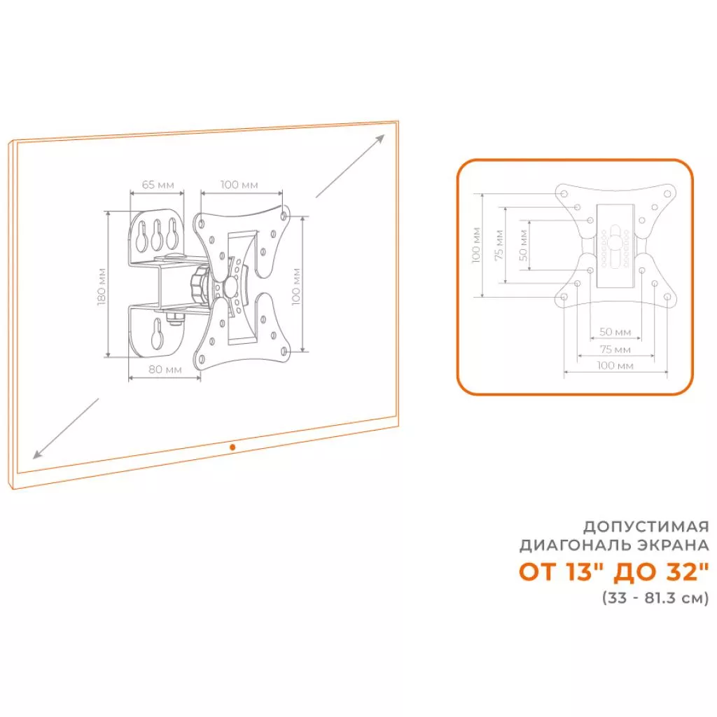 Тип - поворотно-наклонный, минимальная поддерживаемая диагональ - 13", количество степеней свободы - 2, максимальная поддерживаемая диагональ - 32", VESA - 50 x 50, 75 x 75, 100 x 100, Максимальная нагрузка - 25 кг, расстояние от стены - 80 мм, черный