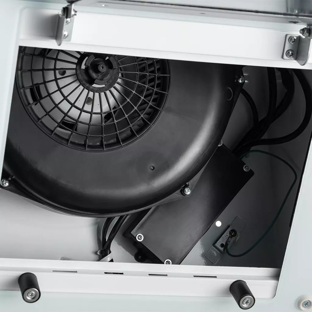Мотор, мощностью 110 Вт. Крыльчатка конденсаторного мотора этой вытяжки вращается в плоскости, которая на 90°С развернута, по отношению к тому, как вращаются крыльчатки в классических моторных группах. Такая конструкция моторной группы немного эффективнее чем стандартная, обладает более высоким КПД, а также тихой работой.