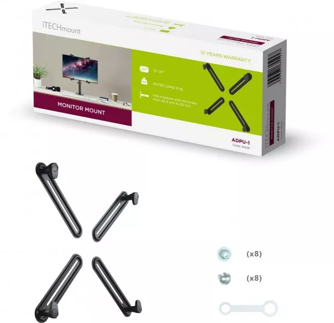 Адаптер iTech ADPU-1 предназначен для мониторов без совместимости VESA, можно монтировать монитор к столу или стене. Предназначен для установки любого монитора с креплением VESA 75x75 и 100x100 мм монтажных отверстий и содержит все необходимые винты и другое оборудование для сборки.