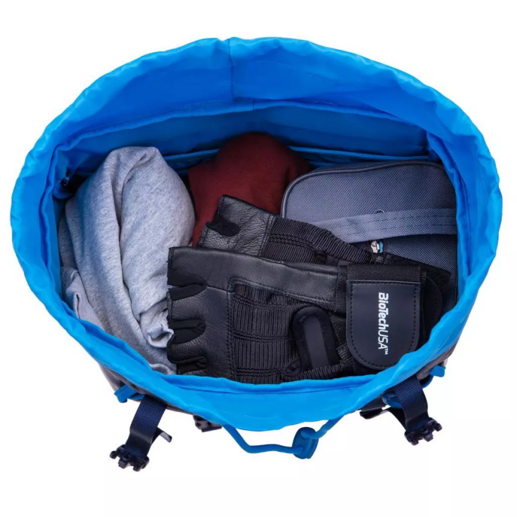 • Просторная секция для перевозки необходимых вещей, документов, спортивной формы затягивается шнуром и дополнительно закрывается на клапан с двумя карабинами.