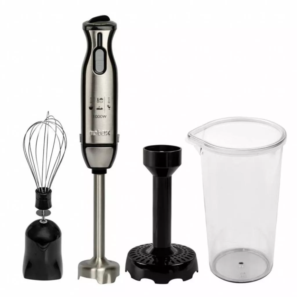 Питание - 220-240В, 50Гц, Мощность 1000 Вт. 2 скоростных режима работы. Регулятор скорости на корпусе. Ножи четырехлепестковые из нержавеющей стали. прочный и долговечный пластиковый корпус со съемной ногой. Нога из нержавеющей стали. Подвесная петля. Аксессуары: мерный стакан 0,6 л, венчик из нержавеющей стали, насадка для пюре.