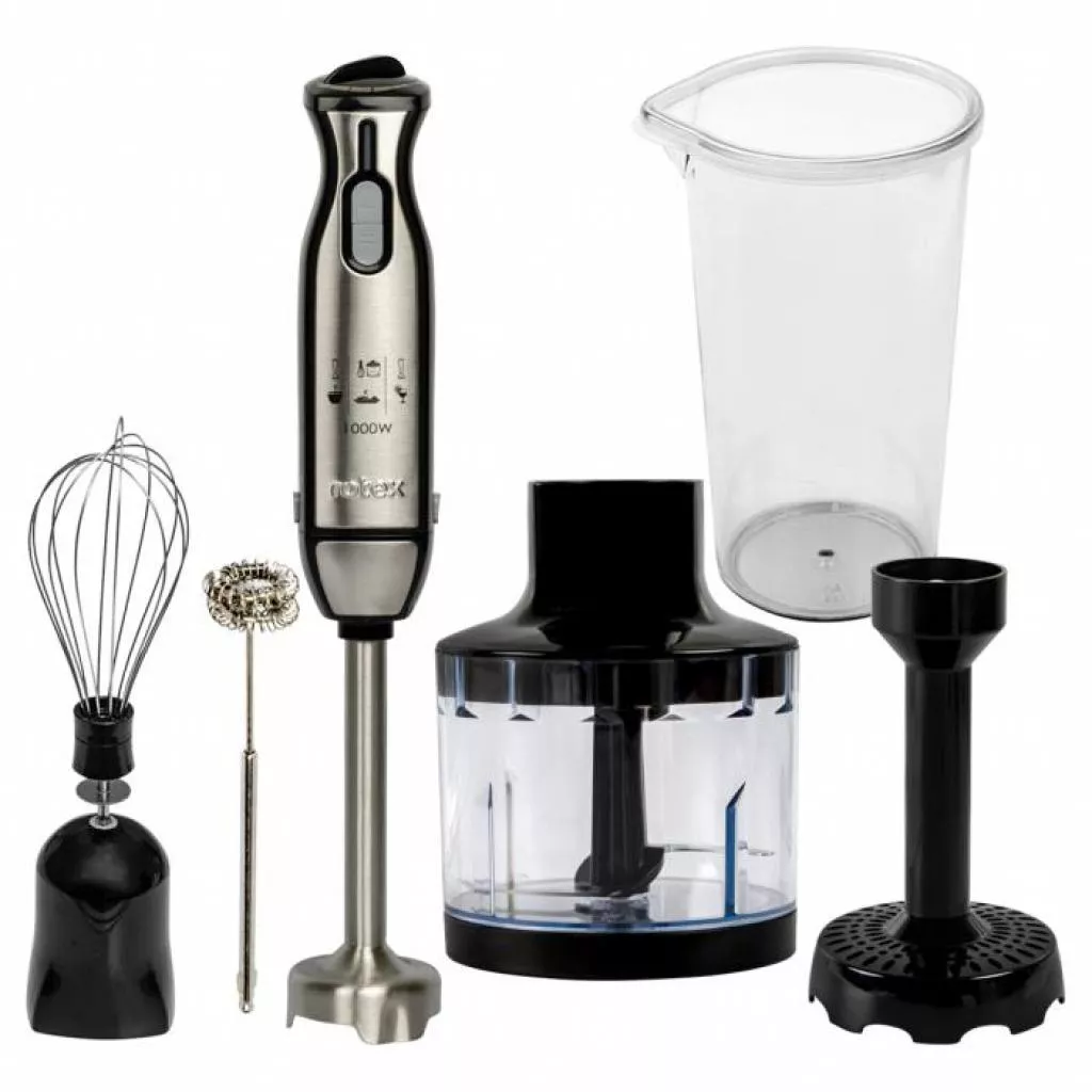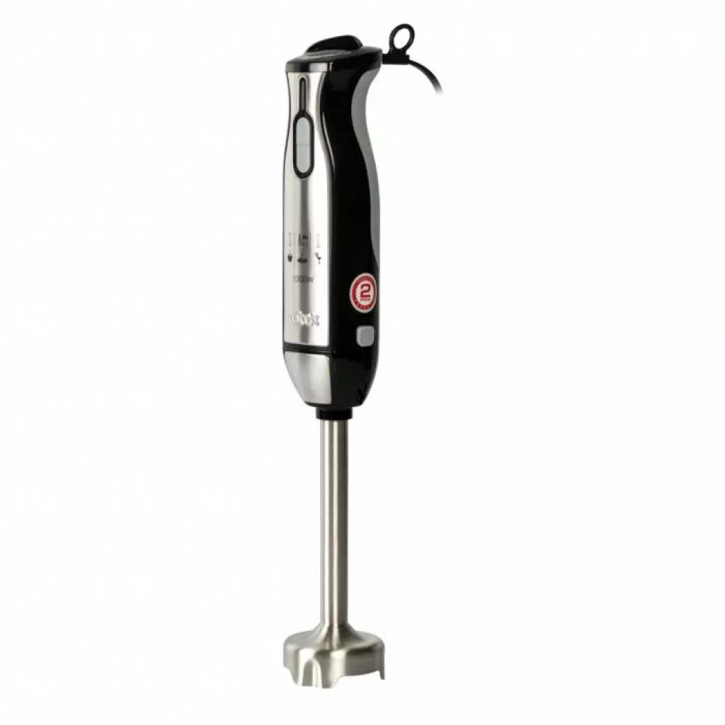 Питание - 220-240В, 50Гц, Мощность 1000 Вт. 2 скоростных режима работы. Регулятор скорости на корпусе. Ножи четырехлепестковые из нержавеющей стали. прочный и долговечный пластиковый корпус со съемной ногой. Нога из нержавеющей стали. Подвесная петля. Аксессуары: чаша с измельчителем 400 мл, мерный стакан 0,6 л, венчик из нержавеющей стали, насадка для пюре, вспениватель молока.
