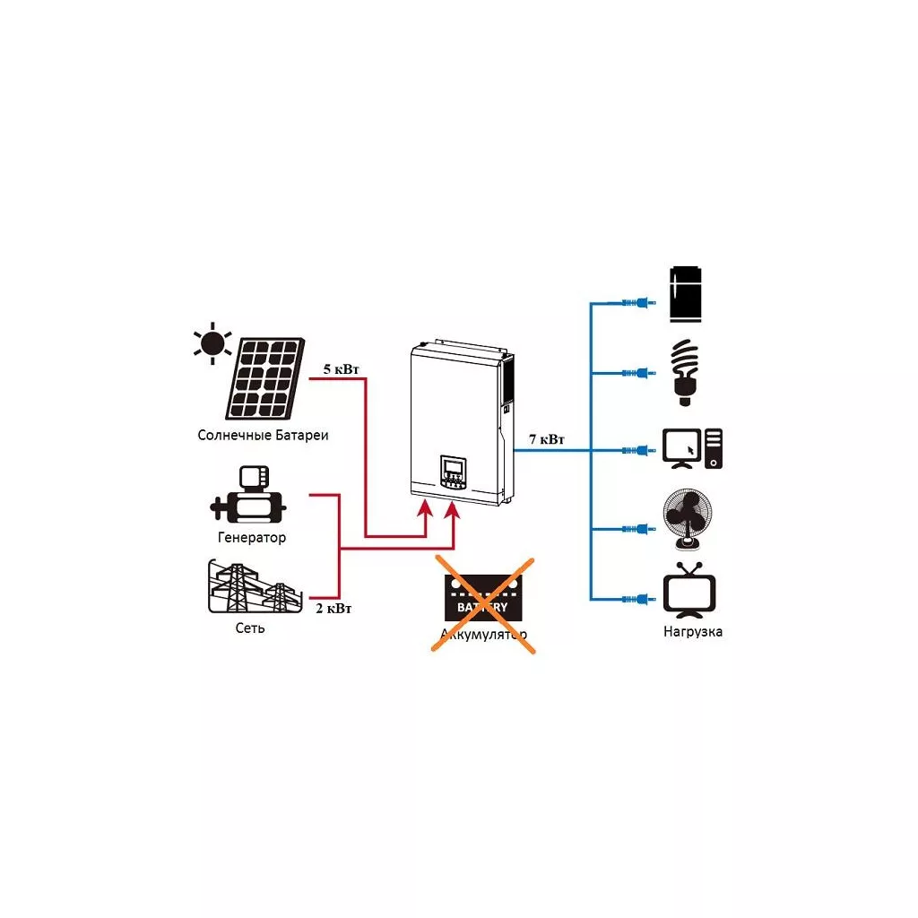 Инвертор для солнечных батарей (8 кВт) питает нагрузку 7.2 кВт и выдерживает мощность в течение 5 секунд до 15000 кВА. Возможность параллельной работы до 6-ти устройств. Поддержка 1-3 фазной конфигурации (синхрон/асинхронная).