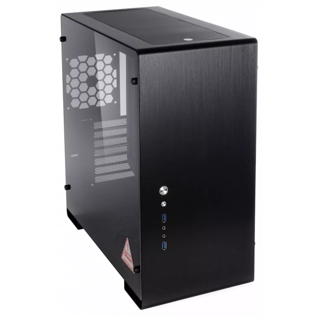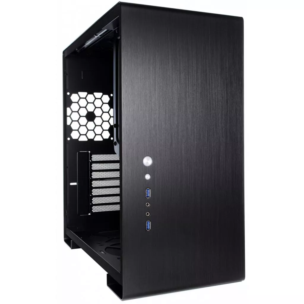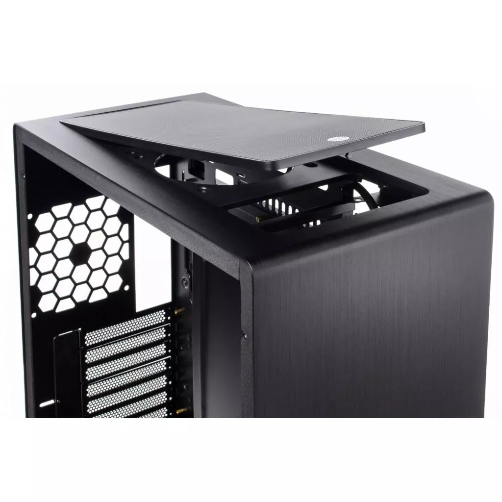 Особенность конструкции корпуса — панели из алюминиевого сплава, изготовленые из алюминиевого 2 мм листа. Такое строгое, в некоторой мере — минималистичное исполнение, отлично подойдет для пользователей, уважающих выдержанный стиль и элегантность. Тут же в нижней трети панели производитель вынес несколько высокоскоростных портов USB 3.0, кнопки включения и принудительной перезагрузки, а также аудио- и микрофонный разъемы. На верхней грани разместился съёмный противопылевой фильтр, препятствующий попаданию мелкодисперсных частиц внутрь компьютера.