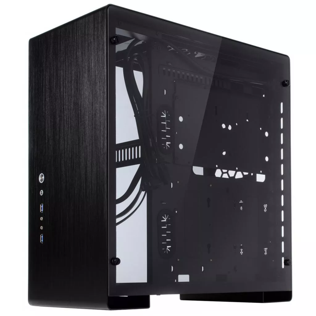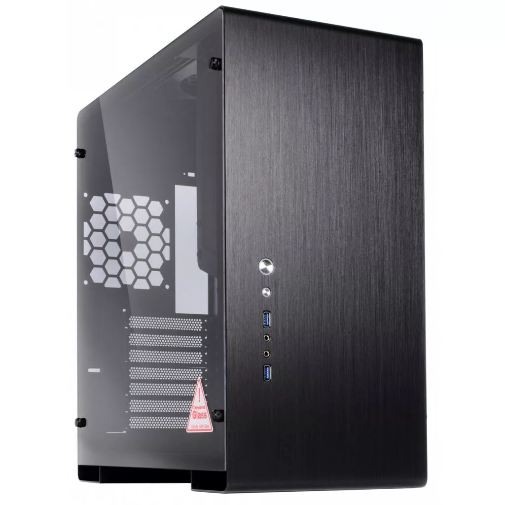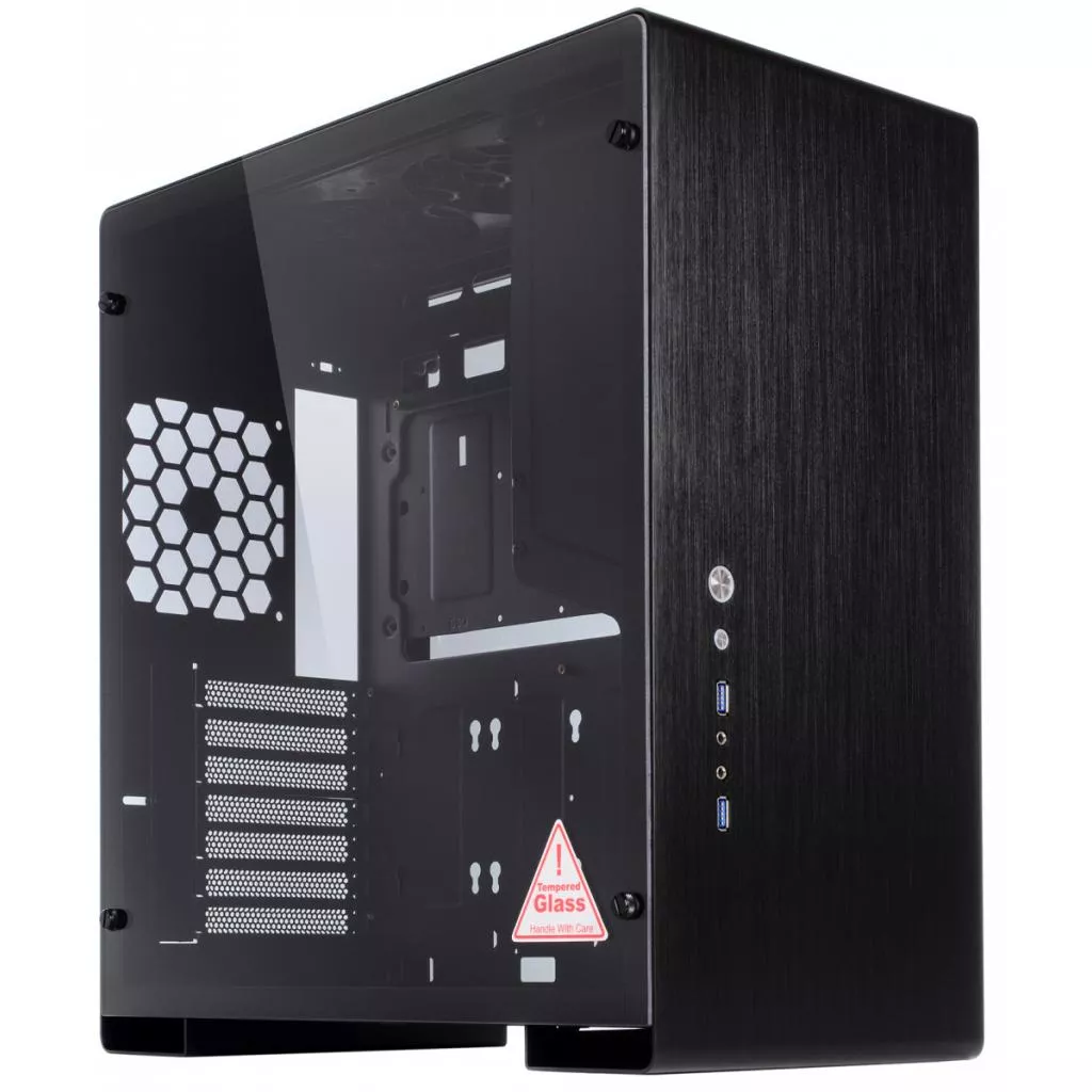 Особенность конструкции корпуса — панели из алюминиевого сплава, изготовленые из алюминиевого 2 мм листа. Такое строгое, в некоторой мере — минималистичное исполнение, отлично подойдет для пользователей, уважающих выдержанный стиль и элегантность. Тут же в нижней трети панели производитель вынес несколько высокоскоростных портов USB 3.0, кнопки включения и принудительной перезагрузки, а также аудио- и микрофонный разъемы. На верхней грани разместился съёмный противопылевой фильтр, препятствующий попаданию мелкодисперсных частиц внутрь компьютера.