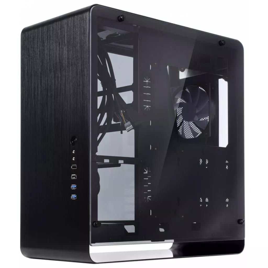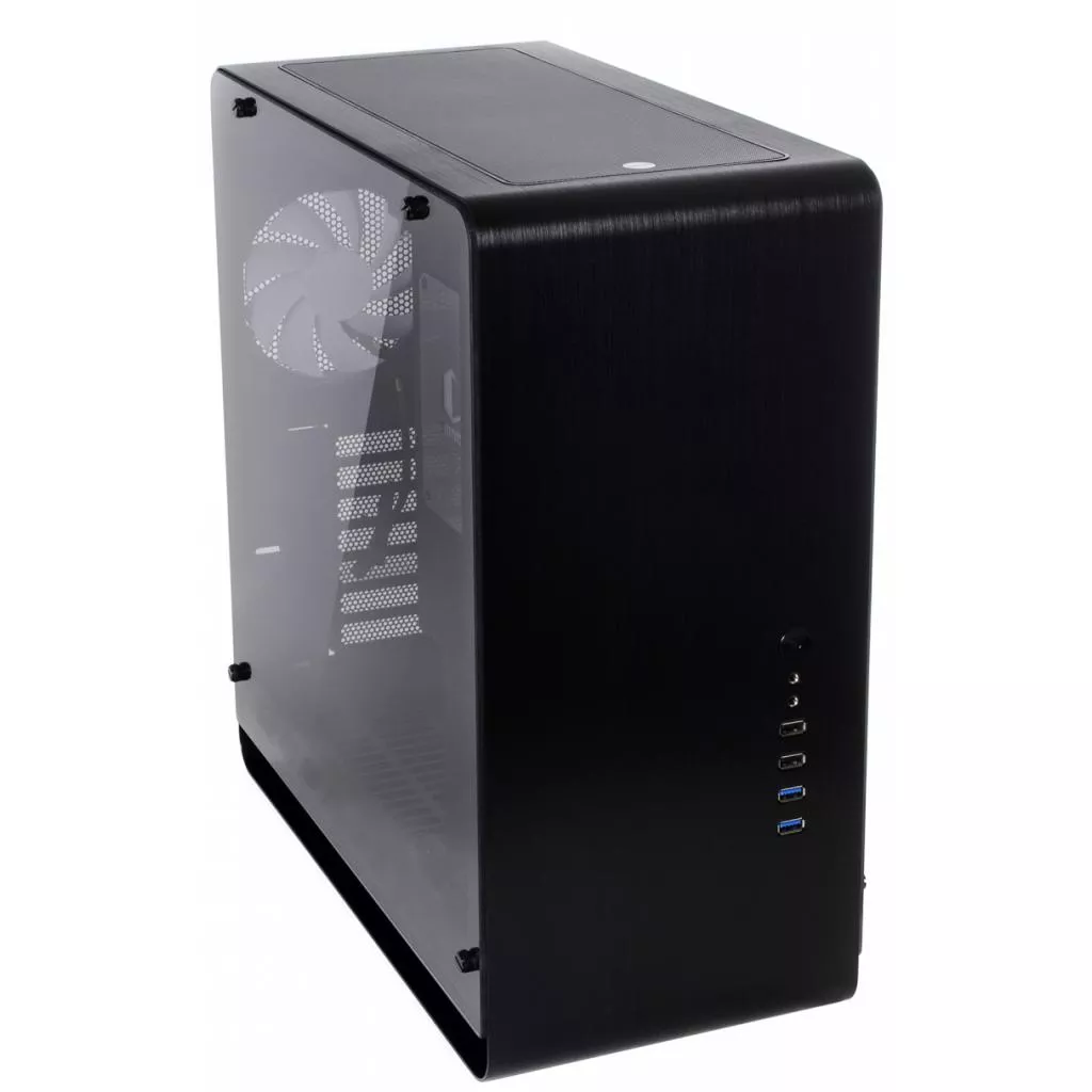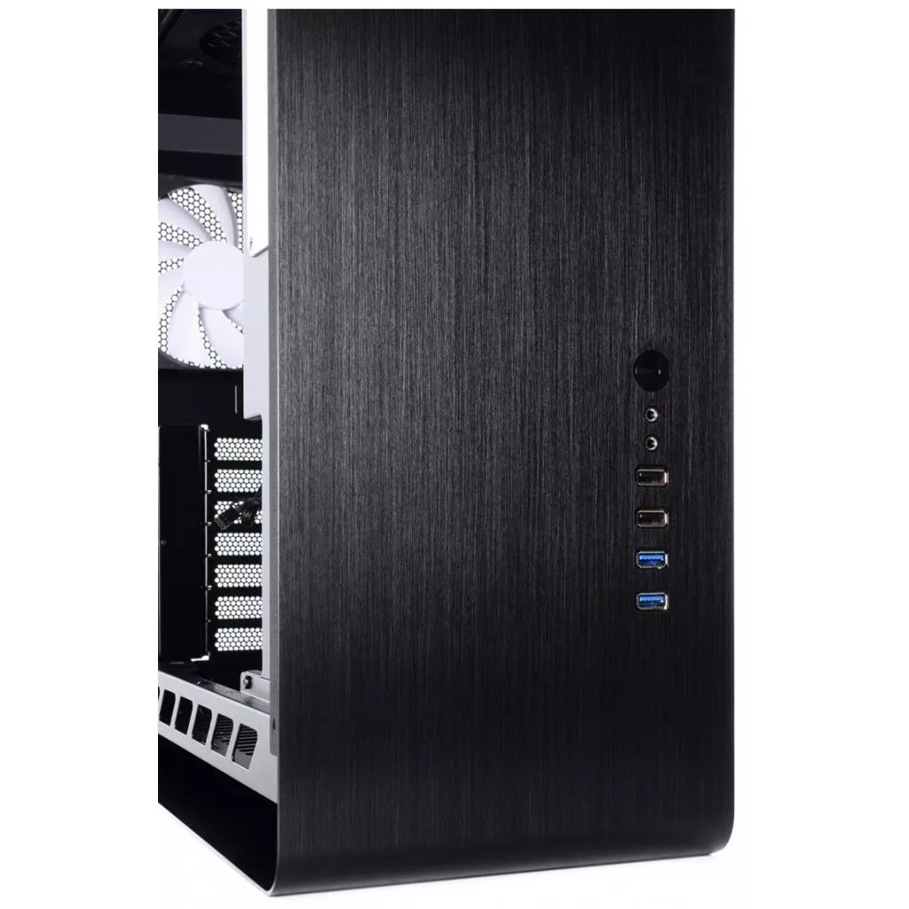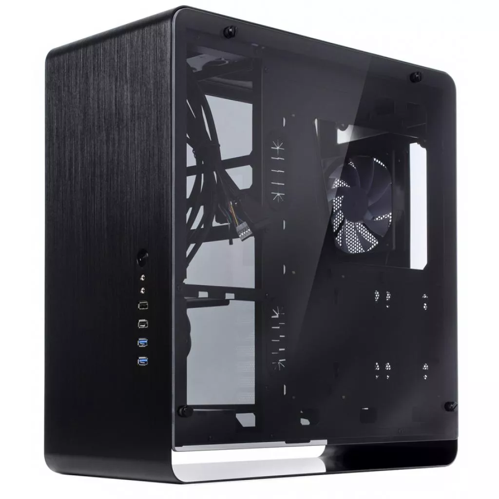 Конструктивно внешняя часть корпуса изготовлена из цельнометаллических черных пластин толщиной 2 мм из алюминиевого сплава, которые как бы обхватывают внутреннюю раму со всех сторон. Такое строгое, в некоторой мере – минималистичное исполнение, отлично подойдет для пользователей, уважающих выдержанный стиль и элегантность. В нижней трети передней панели производитель вынес несколько портов USB, в том числе и два высокоскоростной USB 3.0, кнопку включения, а также аудио- и микрофонный разъемы. На верхней грани разместился съёмный противопылевой фильтр, препятствующий попаданию мелкодисперсных частиц внутрь компьютера.