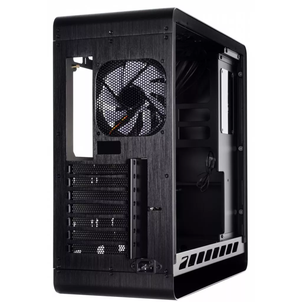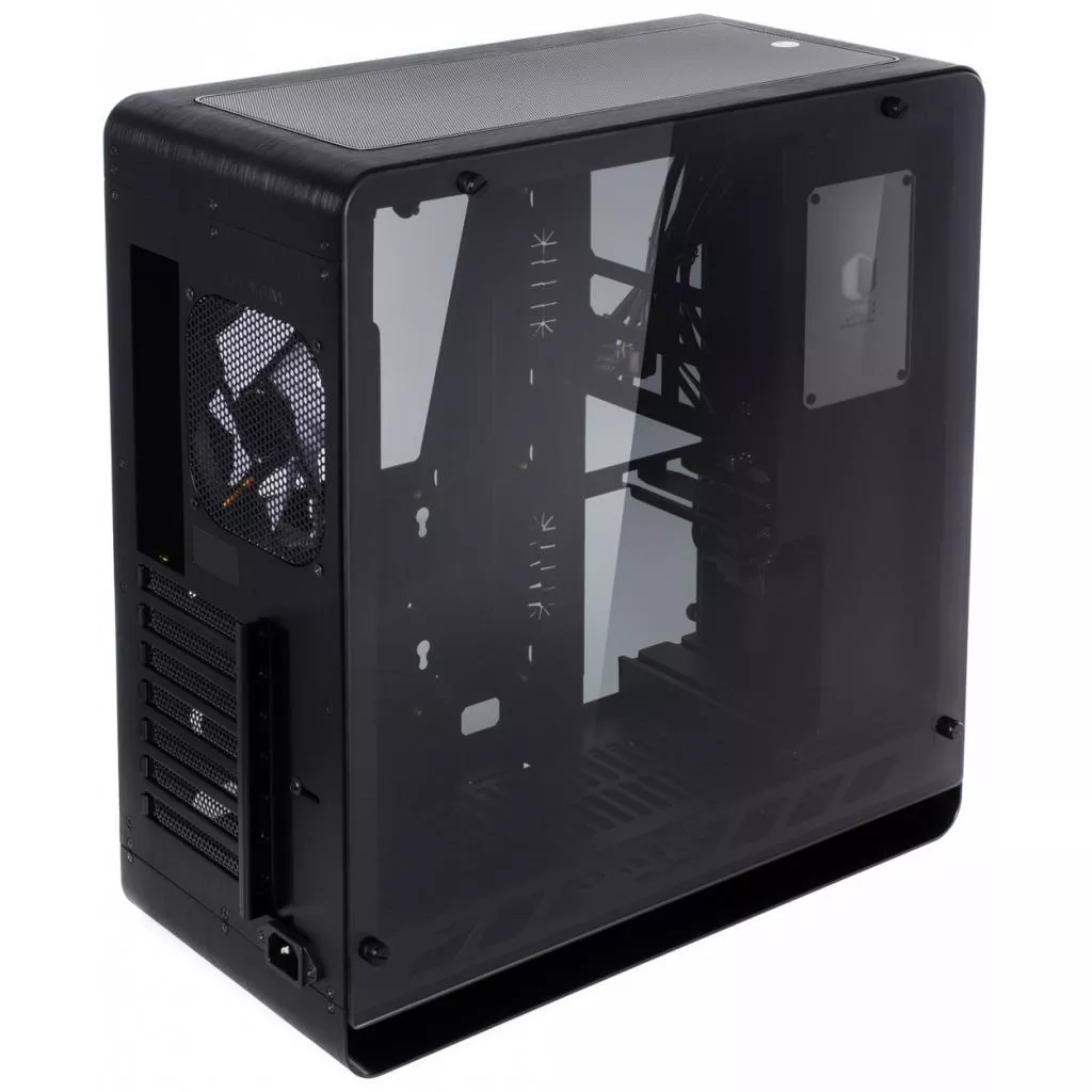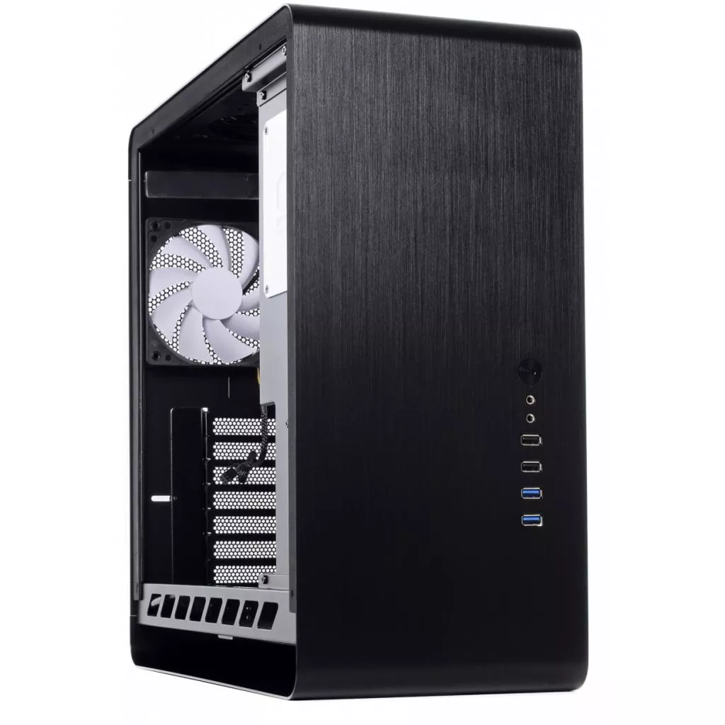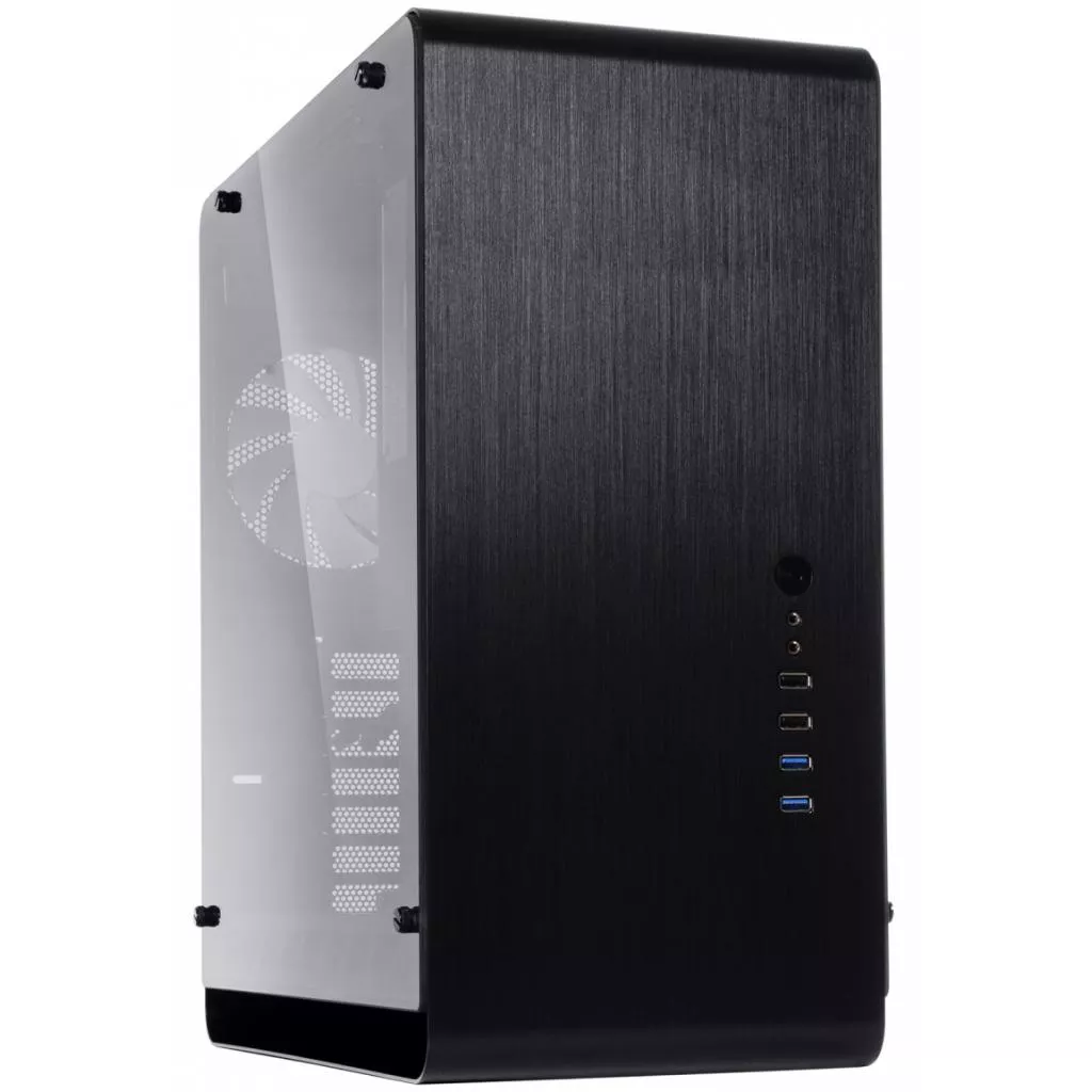 Конструктивно внешняя часть корпуса изготовлена из цельнометаллических черных пластин толщиной 2 мм из алюминиевого сплава, которые как бы обхватывают внутреннюю раму со всех сторон. Такое строгое, в некоторой мере – минималистичное исполнение, отлично подойдет для пользователей, уважающих выдержанный стиль и элегантность. В нижней трети передней панели производитель вынес несколько портов USB, в том числе и два высокоскоростной USB 3.0, кнопку включения, а также аудио- и микрофонный разъемы. На верхней грани разместился съёмный противопылевой фильтр, препятствующий попаданию мелкодисперсных частиц внутрь компьютера.
