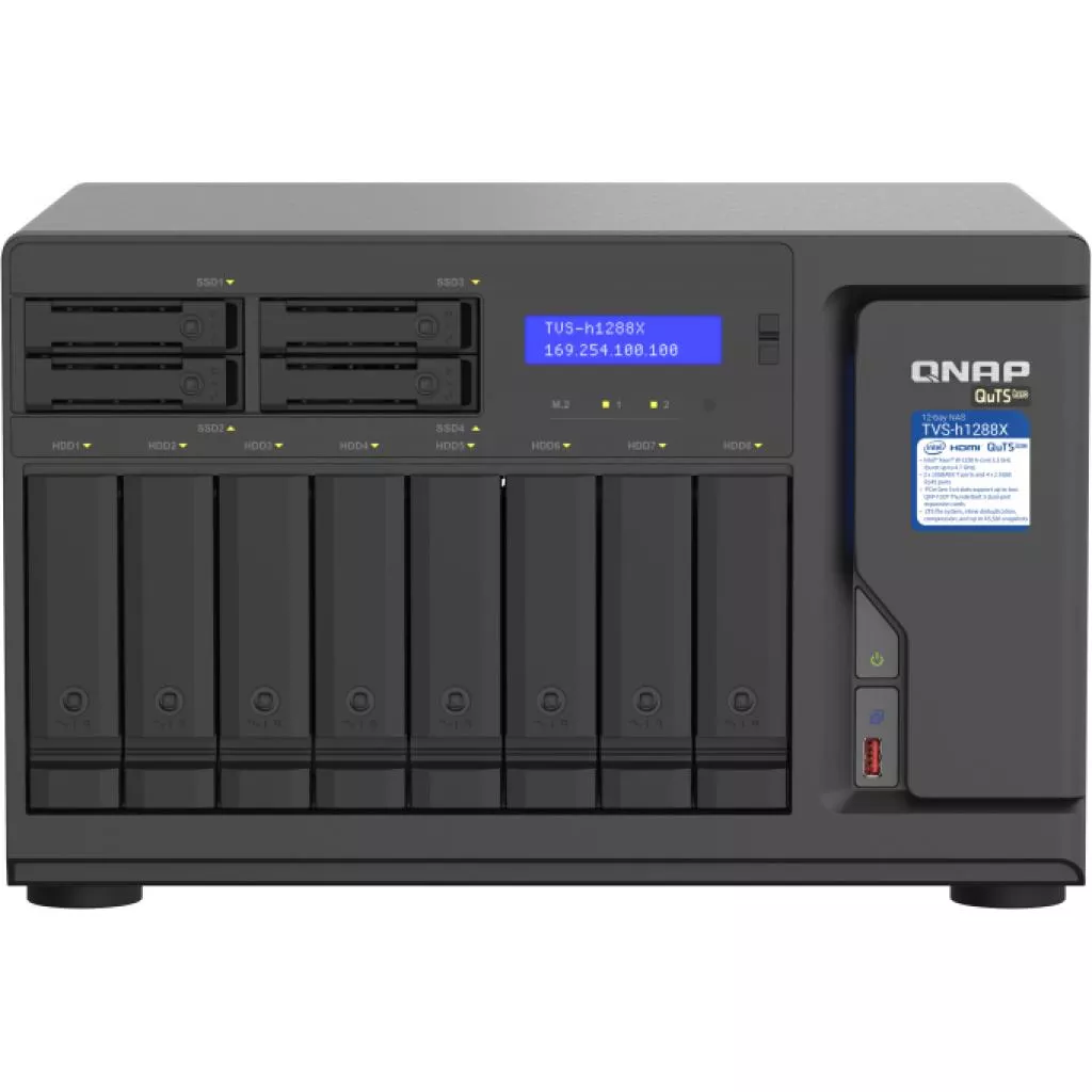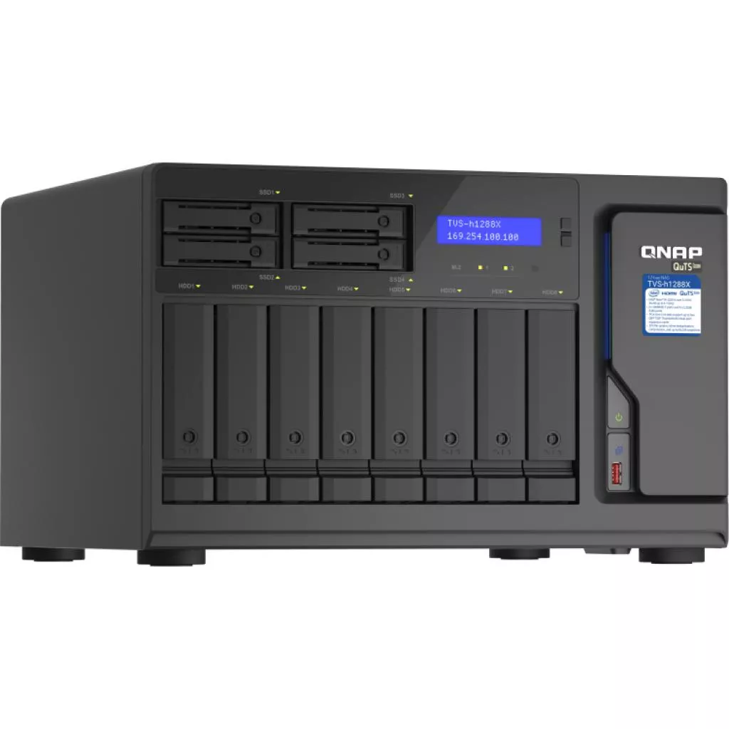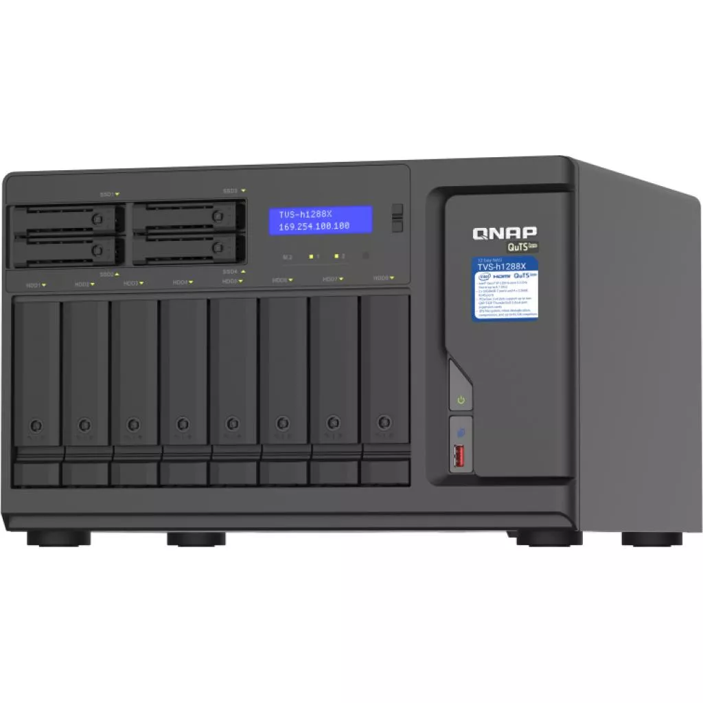 Высокоемкий сетевой накопитель TVS-h1288X оснащен и укомплектован мощным процессором Intel® Xeon® W и поддерживает установку двух PCIe-карт расширения QXP-T32P (продаются отдельно), чтобы получить четыре порта Thunderbolt™ 3 для высокоскоростной совместной работы с файлами пользователей Mac® и Windows®. Встроенные сетевые интерфейсы 10 и 2,5 Гбит/с поддерживают группирование портов и аварийное переключение. Предустановленная операционная система QuTS hero на основе ZFS включает встроенную дедупликацию и сжатие данных на уровне блоков, практически неограниченное количество снимков, репликацию SnapSync в реальном времени и технологии кэширования чтения/записи. Благодаря всему этому TVS-h1288X обеспечивает высокую производительность в разнообразных сценариях: от совместного редактирования мультимедиа и файлового сервера до сервера виртуализации и применения разнообразных приложений для резервного копирования и восстановления файлов.