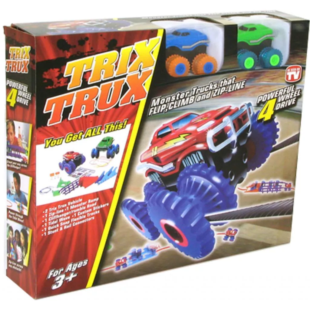 Trix Trux - вездеходы-трюкачи, способные преодолеть самые сложные маршруты. Сделанные в формате монстр-траков, эти машинки могут ездить на задних колёсах, на передних и даже передвигаться по канатной дороге. Trix Trux самостоятельно следует по заранее собранной трассе, преодолевая разнообразные препятствия. Сложность трассы ограничивается лишь фантазией пилота машинки, а это даёт огромное поле для творчества и экспериментов.