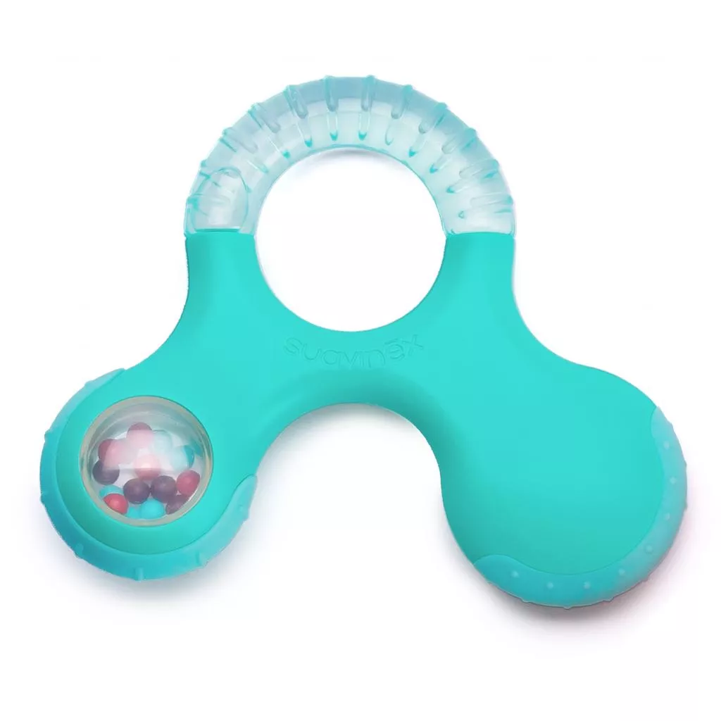 Прорезыватель Suavinex (Суавинекс) с погремушкой поможет малышу справиться с болезненными ощущениями и зудом десен во время прорезывания зубов на каждом из этапов.
