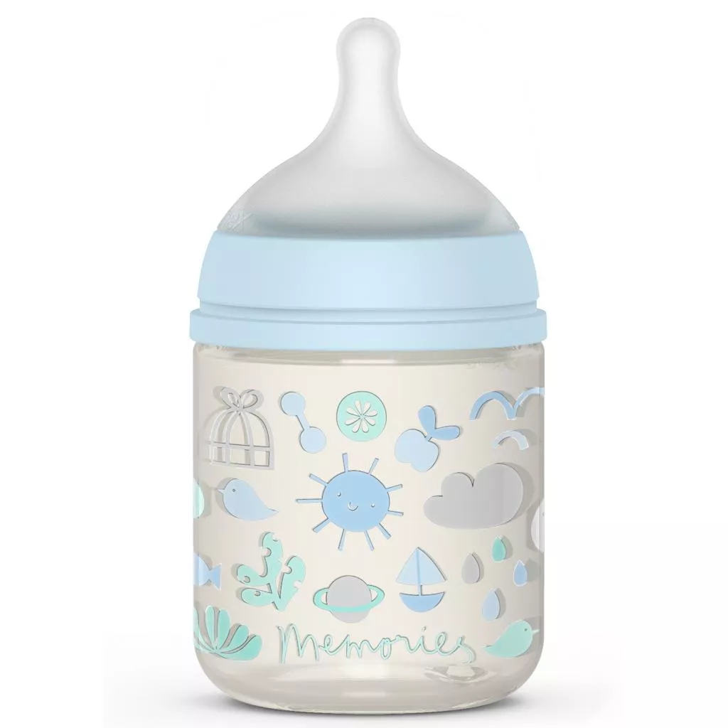 Бутылочка Suavinex 270 мл с коллекция "Memories - истории малышей", укомплектован новой, инновацйною соской с медленным потоком. Важный шаг к более естественному кормлению из бутылочки, с учитыванием развития полости рта ребенка: