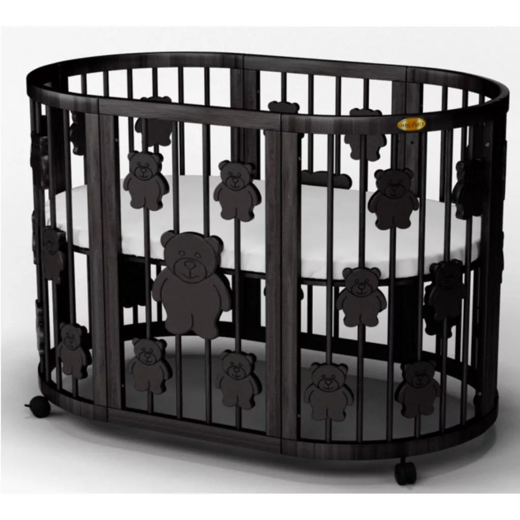 Нарядная овальная кроватка с мишками по всему периметру стенок. Все детали выполнены из экологических материалов! Ручная работа - каждое украшение шлифуется вручную, что гарантирует абсолютную гладкость изделия.