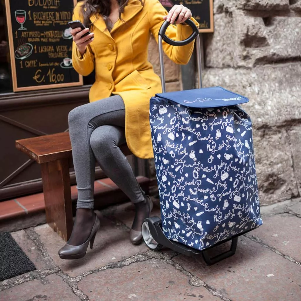 Итальянская сумка-тележка Gimi Easy - это перечень функций и возможностейьная, практичная и легкая в использовании сумка для шоппинга. Объем 50 литров дает возможность легко вместить все покупки. прочный и надежный и стабильный полиэстеровый, водозащищенный материал сумки дает возможность защитить содержимое от внешних неблагоприятных условий будь то дождь или снег. Удобная широкая горловина стягивается стяжным шнуром с фиксатором, при этом дополнительно прикрывается защитным клапаном. Полиуретановая ударопрочная ручка имеет О-образную форму для удобного размещения в ладони. Сумка легко снимается с каркаса шасси, тем самым позволяя транспортировать на базовом шасси сторонние грузы различной формы весом до 30 кг. Блокировка колес сумки-тележки Gimi Easy происходит всего одним нажатием ногой на кнопку. Платформа легко складывается до следующего использование (эксплуатации) или для транспортировки в автомобиле. Дополнительно платформа на тележке оснащен и укомплектована подставкой для зонта. Сумка-тележка Gimi Easy удачный выбор для ежедневных покупок, которая поможет сохранит здоровье спины и суставов, на которые приходится основная нагрузка при ношении тяжестей.
