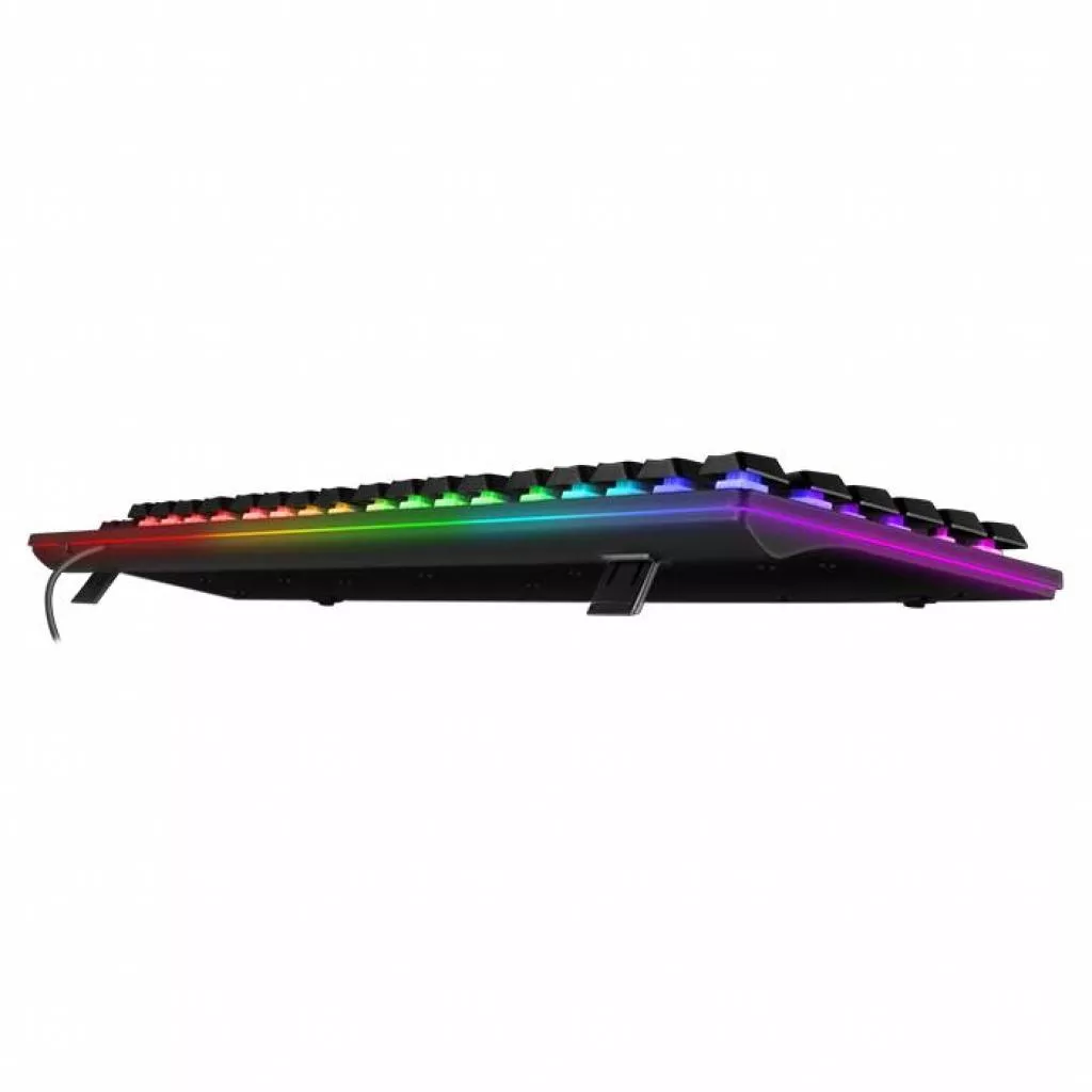 В первую очередь, конечно, стоит упомянуть 104 клавиши, верхний ряд которых при нажатии кнопки-модификатора Fn может выполнять мультимедийные функции: управлять воспроизведением, изменять громкость, переключать треки, запускать приложения и программы, изменять Уровень (степень) яркости, скорость и режим подсветки. Поклонников классических полноразмерных решений и «слепого» метода печати порадуют «двухэтажная» Enter и длинные кнопки Shift. Ну, а, возвращаясь к играм, нельзя не отметить наличие функции переноса кнопок WASD на клавиши-стрелки и обратно. Кабель имеет длину 1,8 метра — ее достаточно для подключения даже к стоящему поодаль системному блоку.