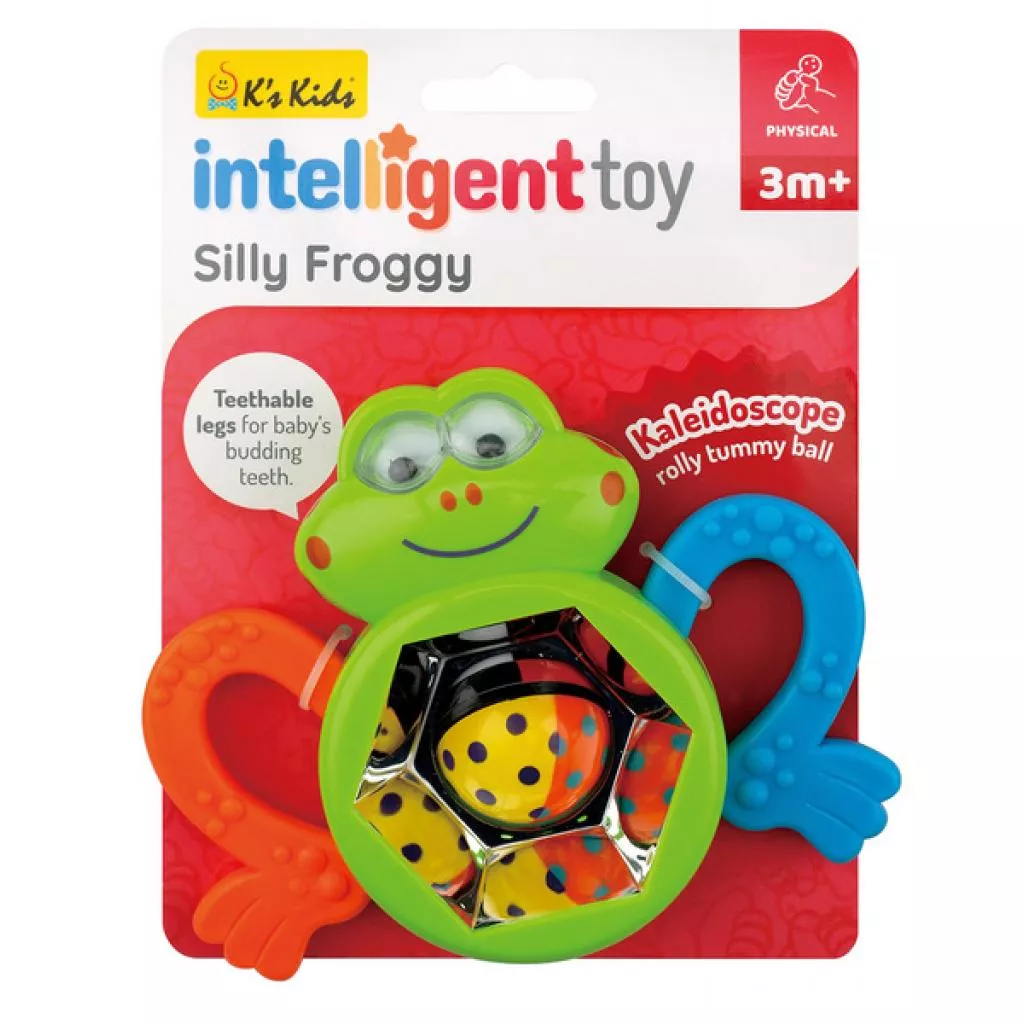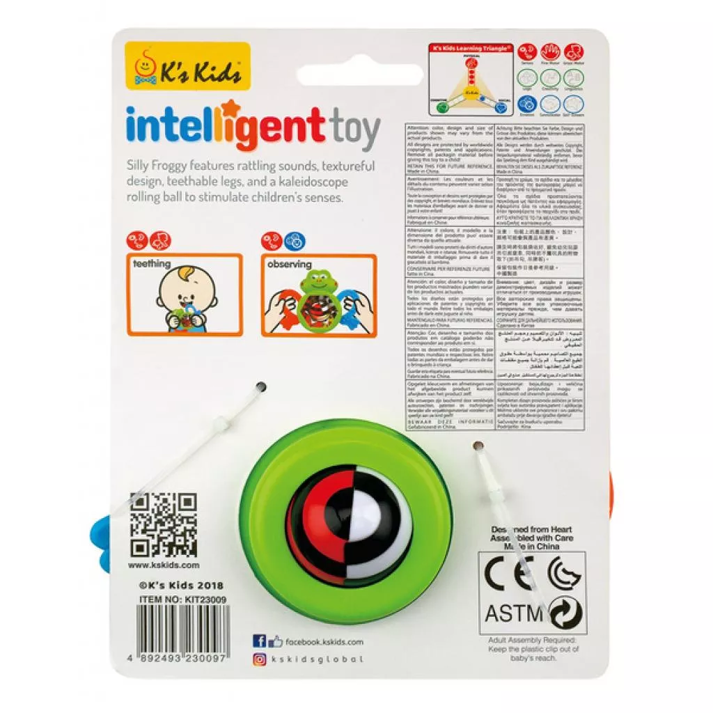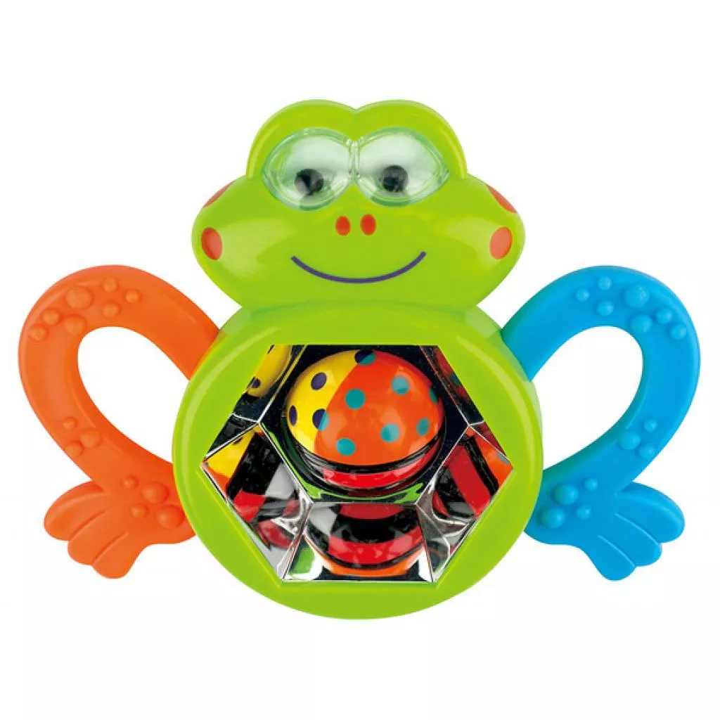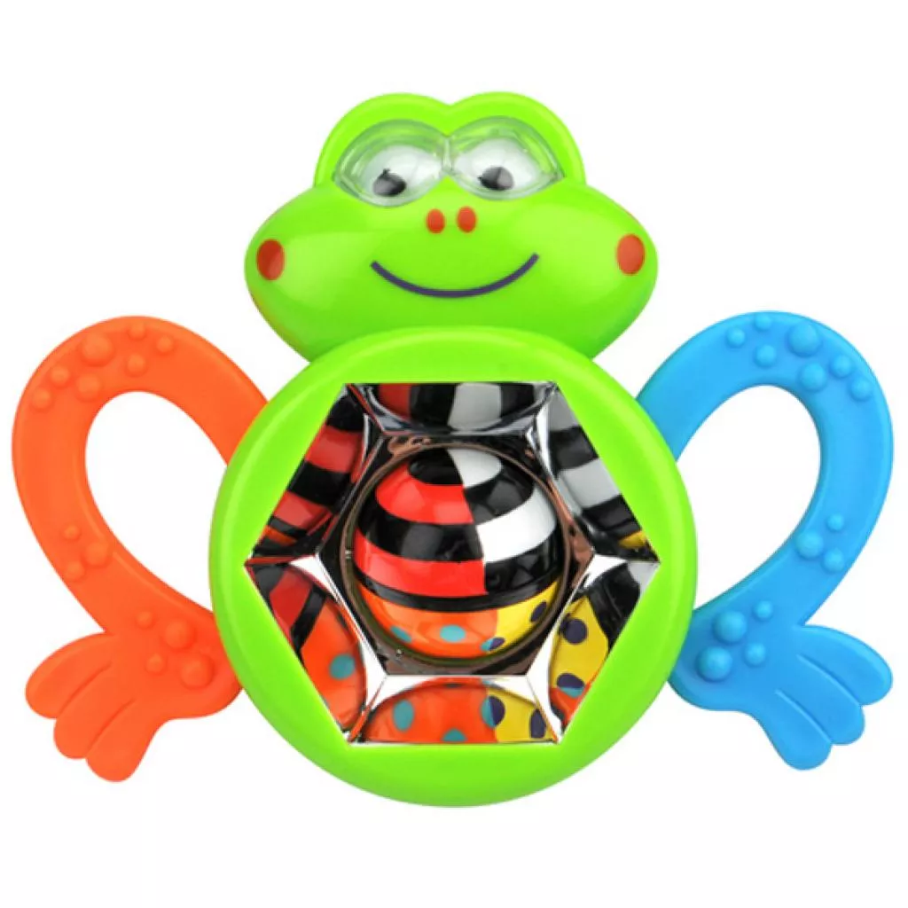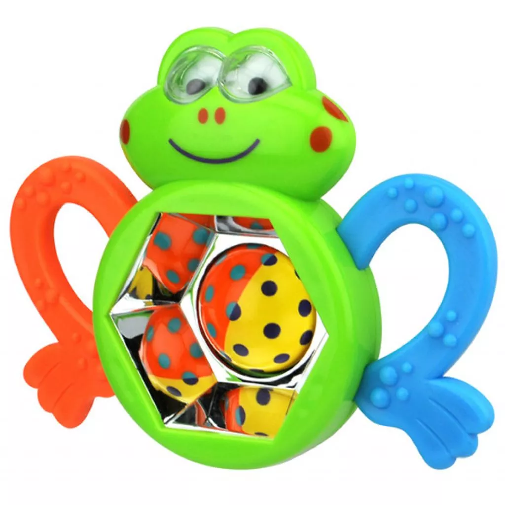 Погремушка в виде лягушки, имеет прорезыватель и шарик-калейдоскоп, который крутится. Игрушка способствует развитию мелкой моторики и слуха, стимулирует интеллектуальное развитие, развивает навыки осязания и познания окружающего мира. Рекомендуемый возраст: от 3 месяцев. Материал: пластик, текстиль. Размер игрушки: 11.5 x 14.5 x 4 см. Упаковка: картонная подложка 14 x 19 см.