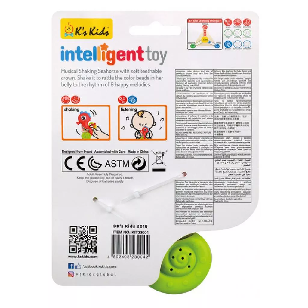 Погремушка в форме морского конька, с прорезывателем. Встряхивание активирует 6 мелодий и световые эффекты. Игрушка способствует развитию мелкой моторики и слуха, стимулирует интеллектуальное развитие, развивает навыки осязания и познания окружающего мира. Рекомендуемый возраст: от 3 месяцев. Питание: 2 батарейки типа LR44 (входят в комплект, не меняющиеся). Материал: пластик. Размер игрушки: 16 x 10 x 3.5 см. Упаковка: картонная подложка 14 x 19 см.