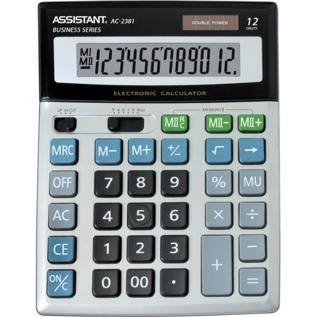 Калькулятор Assistant AC-2381 (000000363) - это качественный настольный калькулятор с большим и удобным 12-ти разрядным дисплеем. Чем больше дисплей у Вашего калькулятора, тем меньше устают Ваши глаза. Привлекательный дизайн в стиле hi-tech сделает калькулятор АС-2381 отличным дополнением Вашего рабочего места. даст возможность легко и быстро просчитать операции с наценками и скидками. Очень удобно для сложных вычислений наличие двух ячеек памяти. Данная модель калькулятора имеет два источника питания. Дополнительным преимуществом является достаточно чувствительная клавиатура с пластиковыми кнопками.