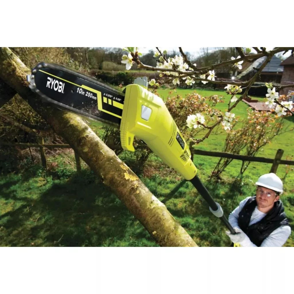 Высоторез электрический RYOBI RPP755E с выдвижной телескопической штангой и стандартным сетевым питанием. дает возможность выполнять обрезку и кронирование плодовых/декоративных деревьев и кустарников без применения специальных лестниц и стремянок. Благодаря пильном полотну длиной 250 мм этот инструмент способен разрезать стволы диаметром до 20 см. Кроме этого, он может быть полезен при формировании живых изгородей, разнообразных одно/многолетних кустарников на приусадебном участке или в дачном саду. Телескопическая штанга высотореза Ryobi RPP755Е имеет длину 2,7 м, что дает возможность срезать ветки расположенные на высоте 4 м, причем делать это можно без дополнительной лестницы.