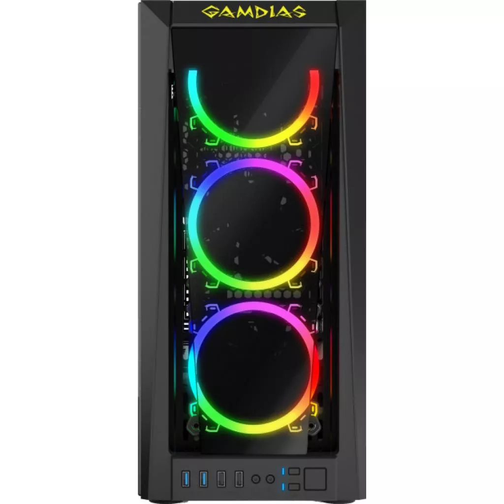 Вы можете поменять местами панель с I/O портами и панель с логотипом Gamdias, чтобы все необходимые интерфейсы были доступны как при размещении корпуса на полу, так и на столе.