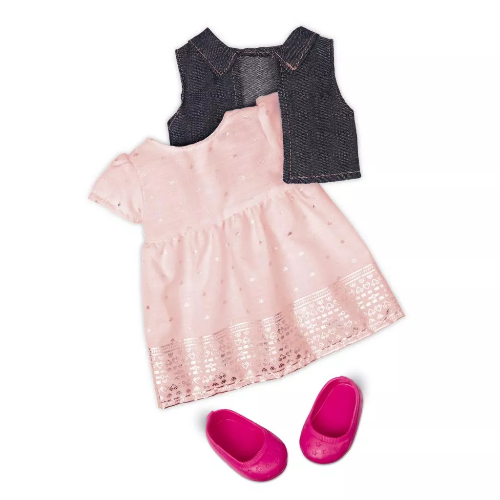 | Комплектация | 1 пара обуви розовые чешки, 2 металлические зажимы в форме сердца, 2 пряди для наращивание волос, жилет, инструкция по укладке волос, нижнее белье, платье с серебряным рисунком, расчёска. |
