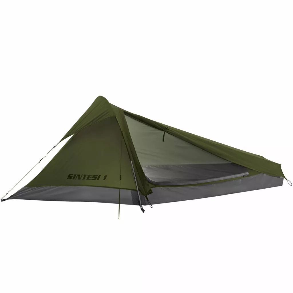 Ferrino Sintesi 1 Olive Green относится к серии (модельного ряда) палаток Ferrino Lite, весит менее килограмма в полной комплектации, и является действительно одной из самых легких одноместных палаток. Данная модель имеет повышенную до 8000 мм вод. ст. водонепроницаемость дна палатки и наиболее подойдет для соревнований по легкоходному туризму, непродолжительных одиночных походов и велотуризма, когда потенциально возможно выпадение большого количества осадков. Туннельная конструкция данной палатки обеспечивает минимальный вес и минимальное время установки. Водозащита внешнего тента составляет 3000 мм вод. ст., что вдвое превышает нормативные требования к водозащитным палаткам и вполне хватает, чтоб сохранить палатку внутри сухой во время дождя средней интенсивности. Палатка имеет одно вентиляционное отверстие и вход, дополнительно закрывающийся москитной сеткой, таким образом эффективное проветривание осуществляется без проблем и ночевка в летнюю жару не вызовет дискомфорта.