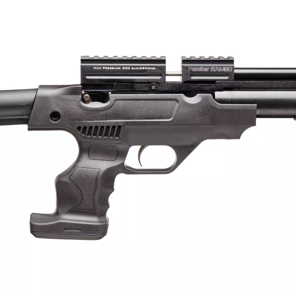 Puncher Rambo - это пневматическая винтовка с предварительной накачкой (РСР). При типичном расположении рабочих частей, как например баллон под стволом и подача патронов из магазина роторного типа, имеет интересный дизайн. Puncher Rambo больше похожа на спортивную пневматику. Рукоятка перезаряжания находится под стволом вокруг баллона для кислорода как, например, в помповых ружьях.