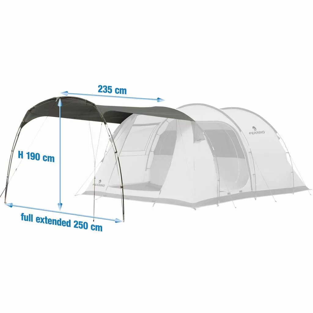 Тент Ferrino Additional Canopy Grey предназначен для увеличения жилого пространства кемпинговых палаток туннельного типа и подходит не только к палаткам Ferrino, но и к другим палаткам аналогичной конструкции, ширины и высоты. Тент имеет универсальное крепление к палатке, оснащен и укомплектован двухточечными оттяжками для повышения и улучшения стабильности и натяжным шнуром. Материал имеет водозащитные и водоотталкивающие свойства, но в первую очередь главное назначение тента - создание тени. Такая приставная веранда может использоваться для обустройства кемпинговой кухни или зоны дневного отдыха.