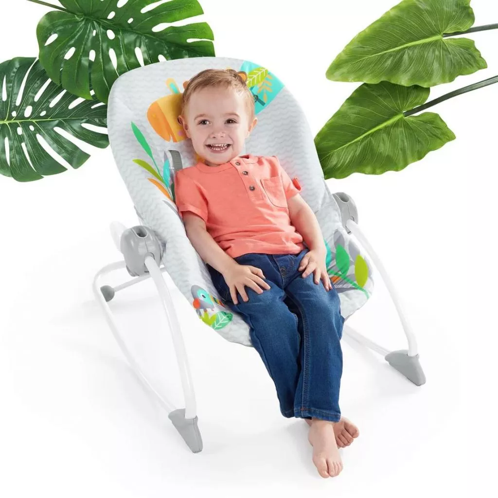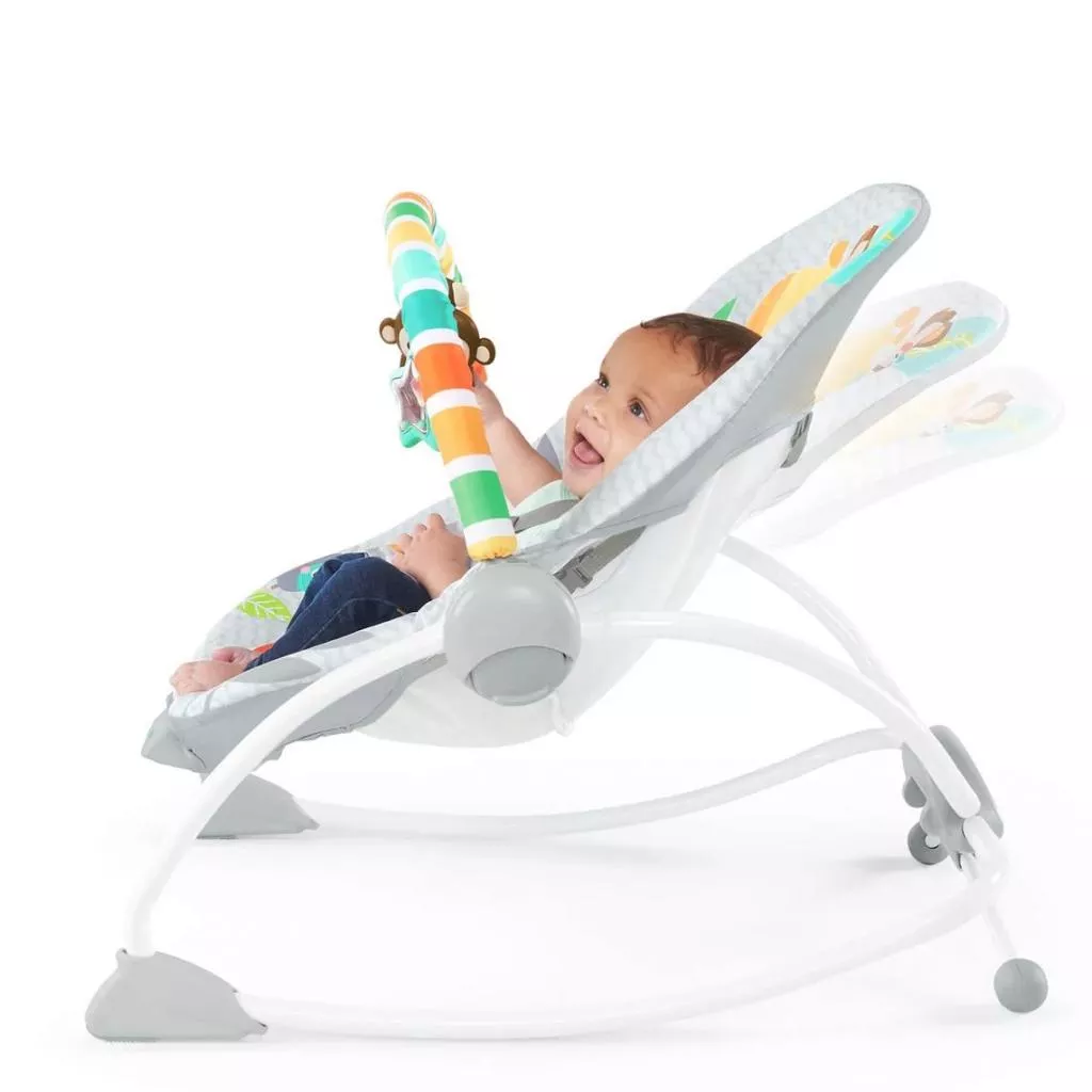 Кресло-шезлонг Bright Starts Safari 2 в 1 с режимом вибрации — незаменимый помощник для родителей во время сна и бодрствования ребенка.