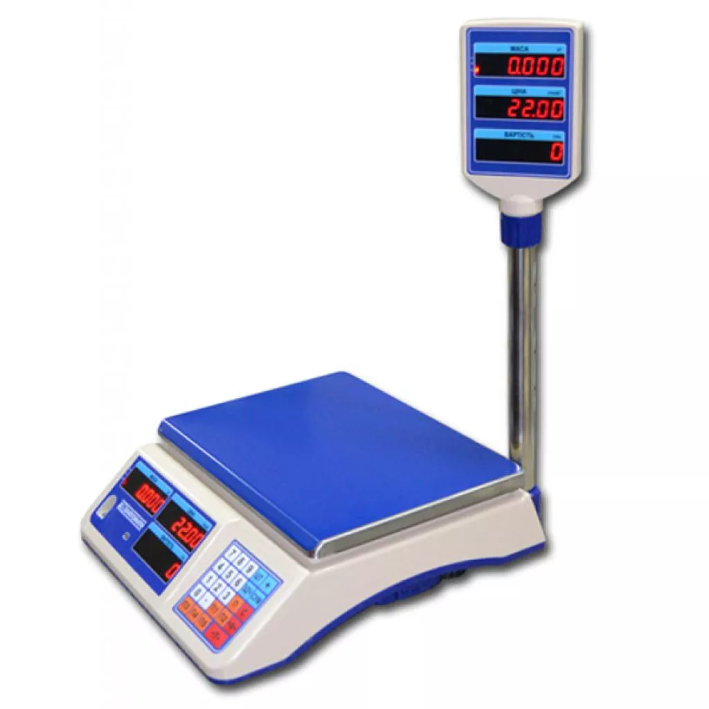 | Дополнительно | автоматическая установка нуля, выборка массы тары, вычисление суммы сдачи покупателю, запоминание цены 5 видов товара, суммирование стоимости всех покупок |